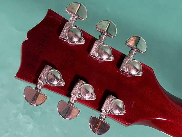 金属パーツには若干クモリが見られますが、動作は良好です。ピックガードにはうっすらピックキズがあり、その他使用に伴うスリキズがありますが、いずれも深いモノではなく遠目からは目立ちません。ヘッドの裏とネック裏には打痕があり、ネック裏の打痕は握った時に感触がわかる程度に深いので繊細な方にはオススメ出来ません。