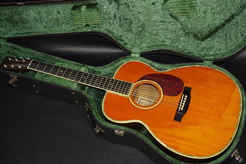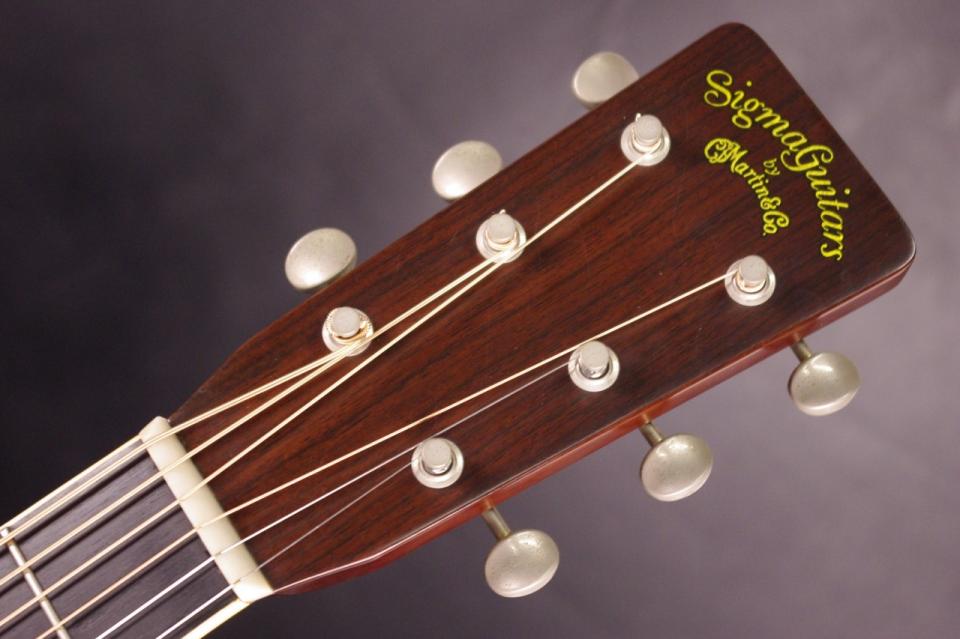 国産Sigma By MartinのSEC-1500Rが入荷しました!!トップはスプルース単板、サイドバックにはローズウッド合板、指板とブリッジにはエボニーを採用、指板にスノーフレイクとキャッツアイのポジションインレイの入った000-42タイプで高級感があります!クルーソンタイプのペグ、べっ甲柄ピックガードなど主なパーツもオリジナルで残っていました。トップのブリッジ下にクラックリペア箇所があります。演奏上は全く支障ございません。またバックのセンター近くに8㎝くらいのネームの日焼けがありますが目立ちません。ネックヒールへはストラップピンが打っています。ピックアップの取り付け加工はございません。ナット幅は約43mm、やや薄めのVシェイプで握りやすいサイズです。ネックのアングルも理想的でトラスロッドの動作にも余裕がありました。フレットの減りも少なく今後も安心いただけます。弦高は12フレット6弦側で約2.3mm、1弦側で約1.5mmの高さで押さえやすく調整しています。お好みに合せた微調整にもお応えいたします。マーティンと比べると明るく硬質で輪郭がはっきりとしています。特にフィンガーピッキング中心で演奏される方におすすめ!ハードケース付
