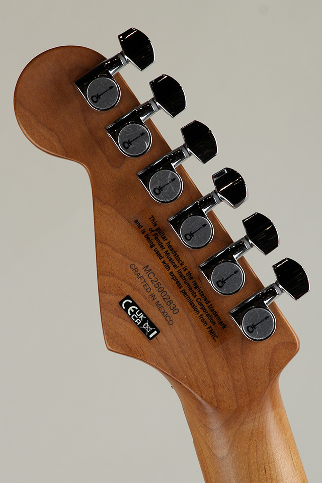 豊かでダイナミックなトーンを奏でるキルトメイプルトップのアルダーボディには、グラファイト補強ロッドを内蔵したボルトオン式キャラメライズドメイプルネックを装備し、温度や湿度などによる環境変化の影響を最小限に止め、高い安定性を実現します。キャラメライズドメイプル指板は12-16インチのコンパウンドラジアス仕様で、滑らかにロールオフ処理されたエッジと、4mmパーロイドドットインレイを採用しています。薄めのDシェイプネックと22本のジャンボフレットも、より速く、優れたプレイアビリティに寄与します。また、蓄光式Luminlayサイドドットは、暗いステージでも容易にフレットポジションを視認することを可能にします。