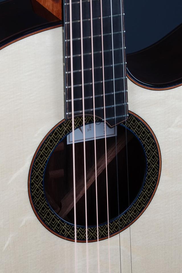 ブレーシング材も色々と変えていて、一弦側のトーンバーにパデュークを使ったり、ボディの中も色鮮やかで、びっくりしました。