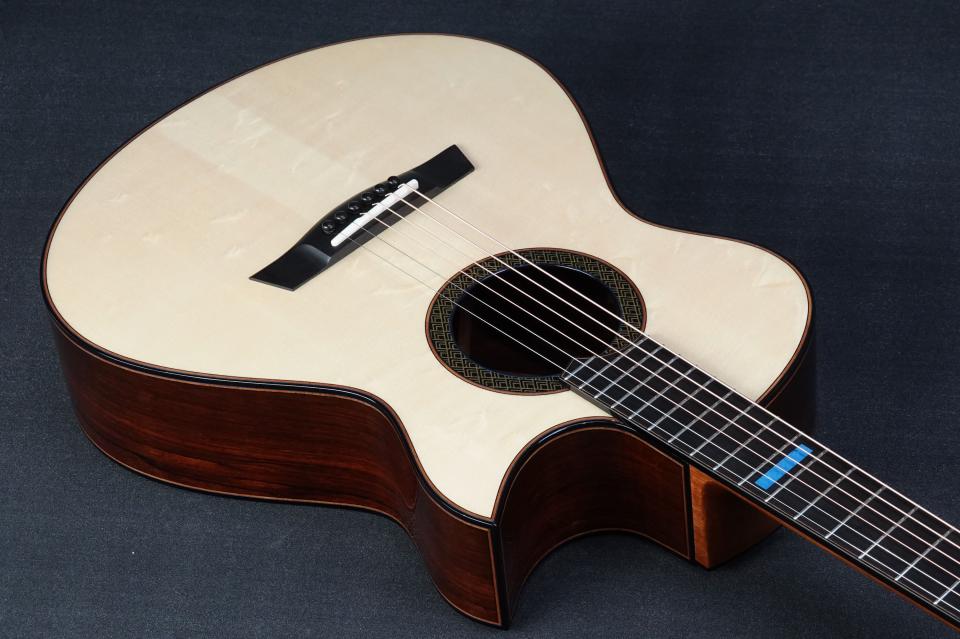 厳選された木材を使った、フローレンタインカッタウェイ仕様のエレガントなOMモデルです。