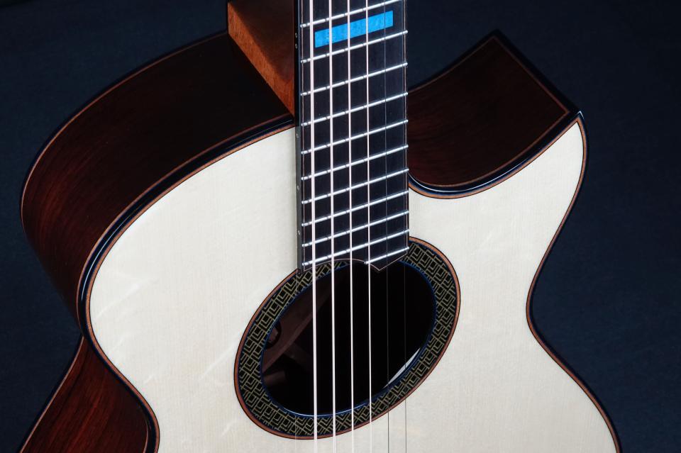 ブルーカラーのアクセントに、パーフリングはマホガニー。