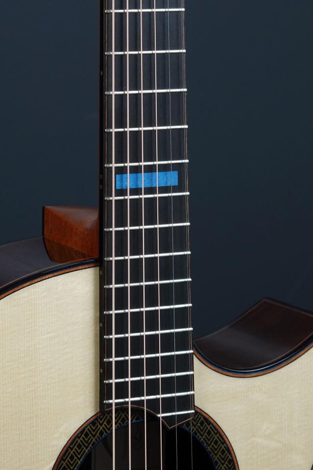 ボディ外周のパーフリング、ヘッド指板、サイドバックなど、随所に印象的なブルーカラーが使われています。