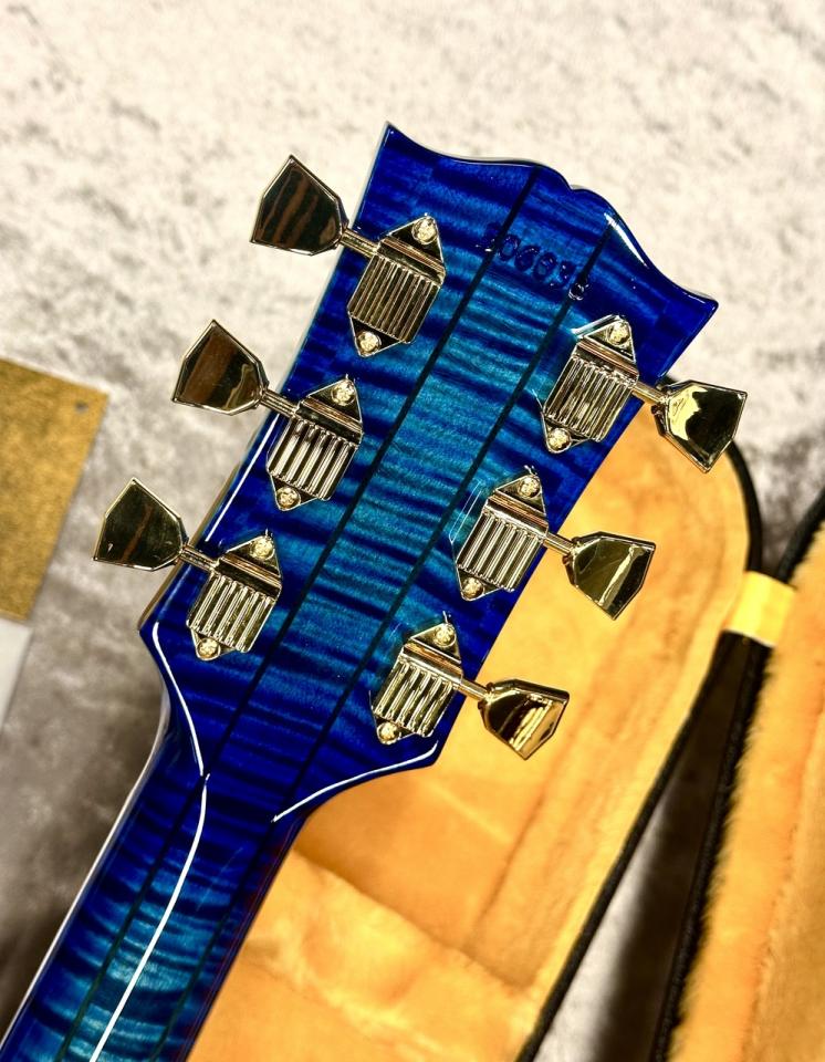 ブックマッチの玉杢キルトが印象的なトップを持ち、鮮やかなTrans Blue Burstカラー、ゴールドパーツも高級感を演出しています。