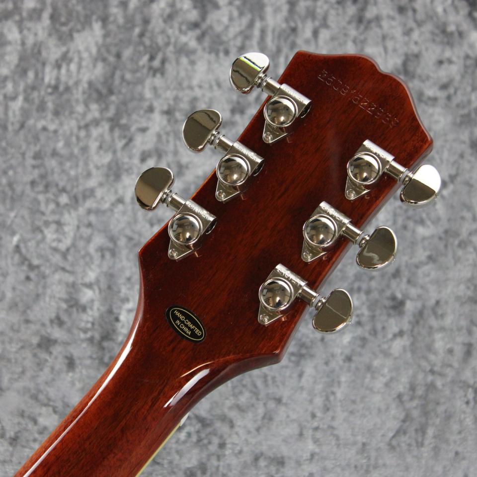 ボディ・トップにはメイプルが貼られ、杢目を際立たせるトランスルーセント系カラーにはAAA グレードのフレイム・メイプル化粧板がトップにあしらわれ、往年の”フレイム・トップ”の外観を醸し出しています。ローレル指板上ではパーロイド素材のディッシュ・インレイが施され、ミディアム・ジャンボ・フレットを採用。60s SlimTaperプロファイルのネックシェイプはスムーズな演奏性に寄与し、ヘッド部に装着されたGrover RotomaticチューナーとGraph Techナットは安定したチューニングをもたらします。エピフォンの定評ある2基のProbuckerピックアップを採用し、ネック・ポジションにはProbucker 2を、ブリッジ・ポジションには出力が高めに調整されたProbucker 3を搭載。それぞれのピックアップは一対となるCTSボリューム&トーン・コントロールに接続されています。