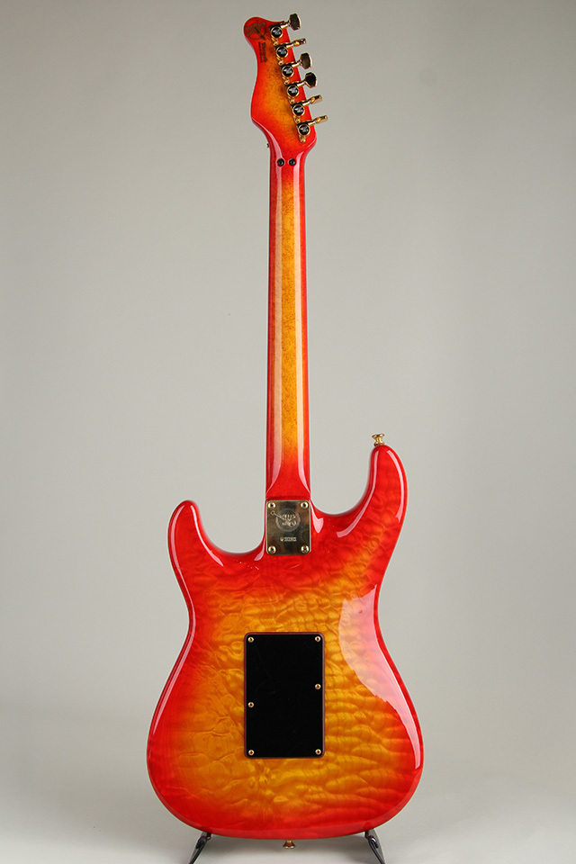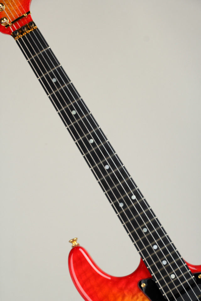 豪華な1pcキルトメイプルボディにきれいに杢目の出たバーズアイメイプルネック、エボニー指板が採用された当モデル。SSHレイアウトのEMGピックアップにシンプルな1ボリューム/5way-SW、黒/赤/黒の3プライピックガード、リセス加工なしのフロイドローズと、スティーヴ・ルカサー仕様の1本になっております。