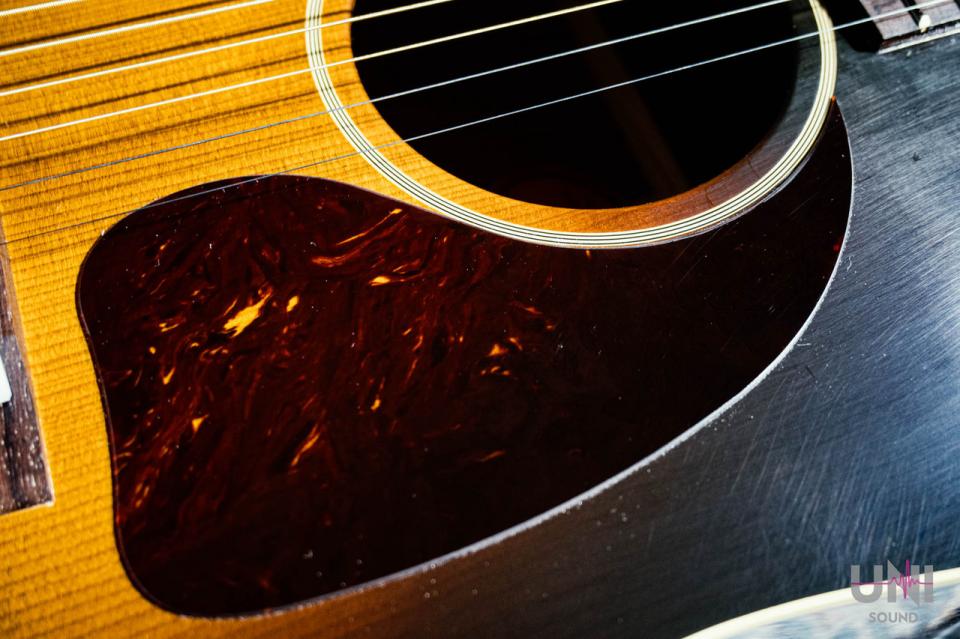 今回入荷したモデルは2021年製のカスタムショップ製。トップにはサーマリー・エイジド・アディロンダック・レッド・スプルース、サイド&バックにはマホガニー使用し、40年代中ごろまでの仕様であるプリ・ウォー・スクリプトロゴと"ONLY A GIBSON IS GOODENOUGH"のバナーヘッドという見た目もヴィンテージライク。
