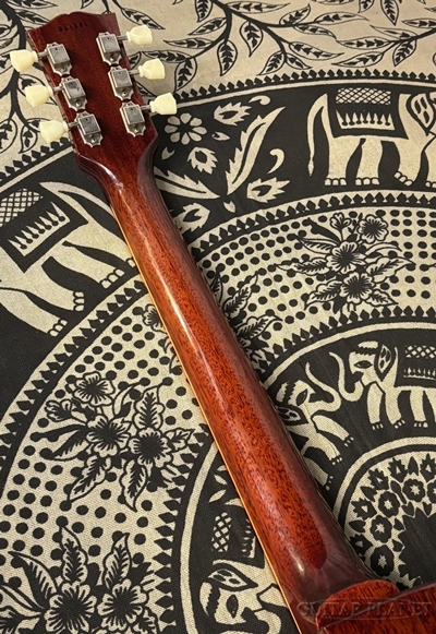 トップバランスの美しいフィギャードメイプルトップ。カラーもチェリーバーストが経年変化によって退色したルックスを上手く再現されております。