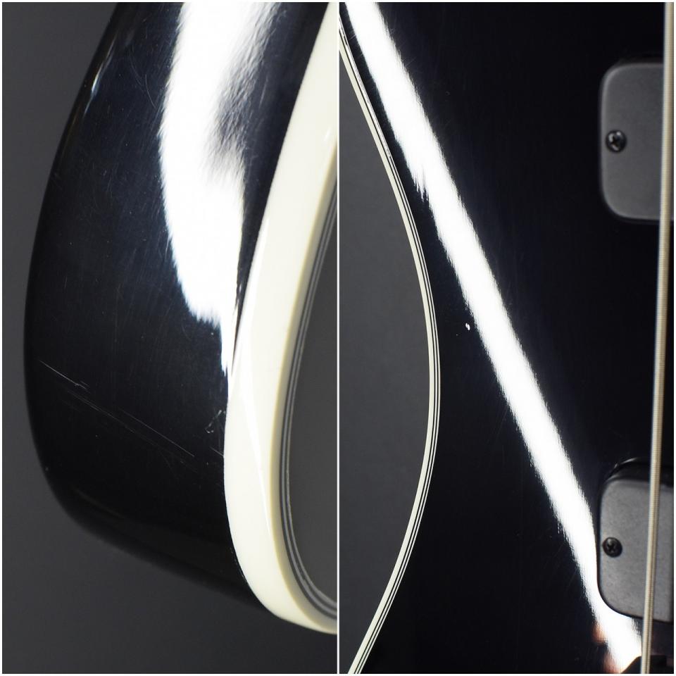 ボディとヘッドに加え、ネック裏もブラックで塗装した統一感のあるカラーデザインに、鏡面仕上げのピックガードとトラスロッドカバー、ホワイトのバインディングにパーロイド・リバース・スプリット・ダイアモンドのインレイを添えて、黒白のコントラストを基調としたルックスです。