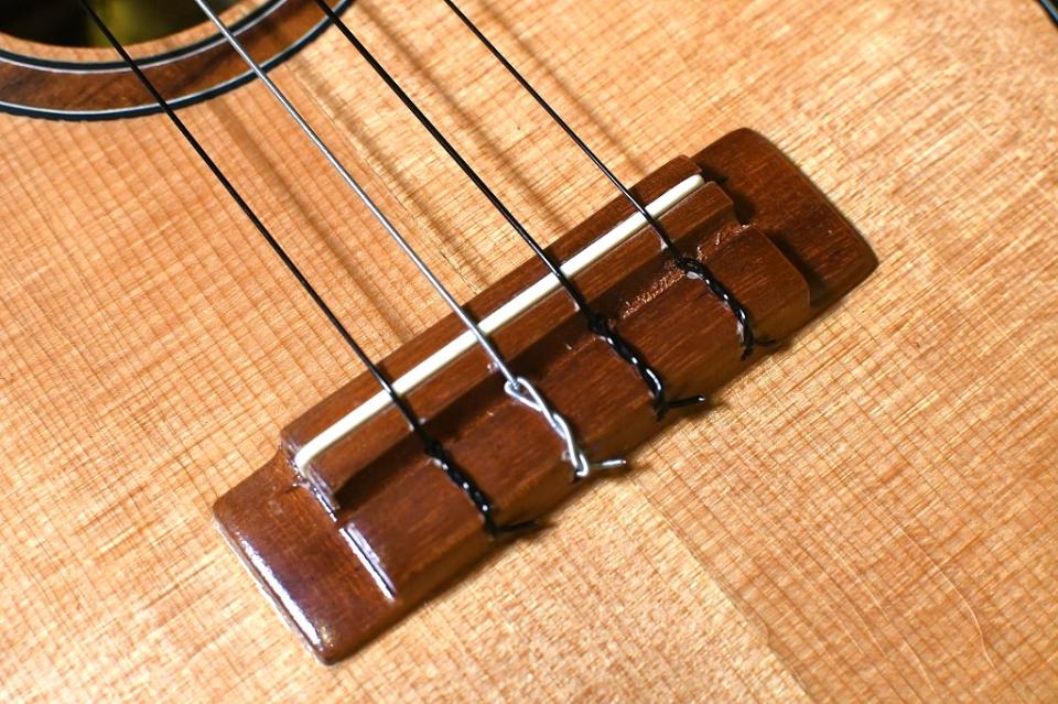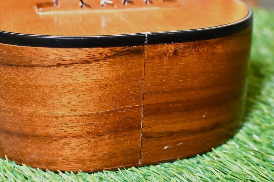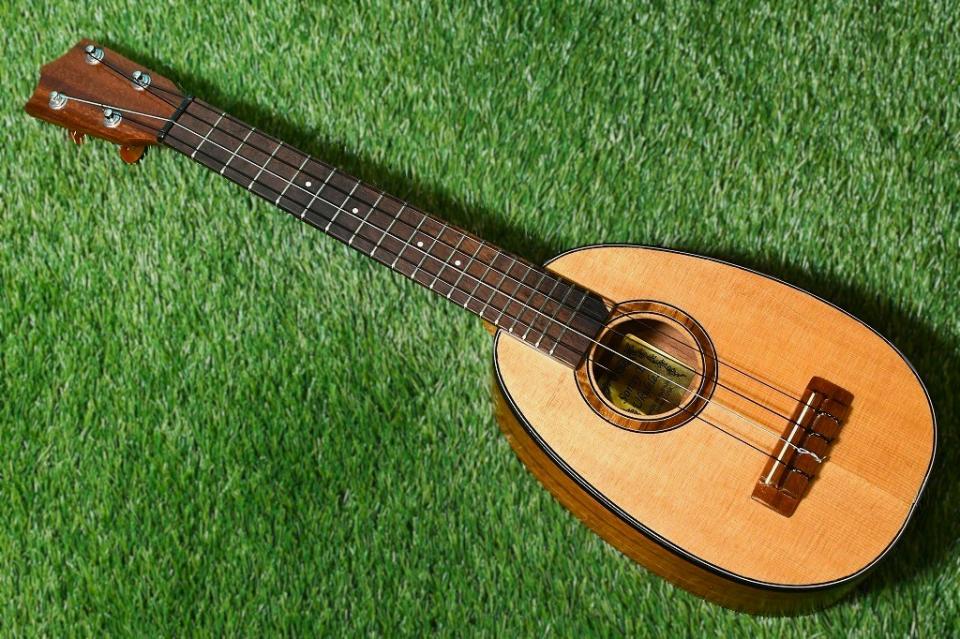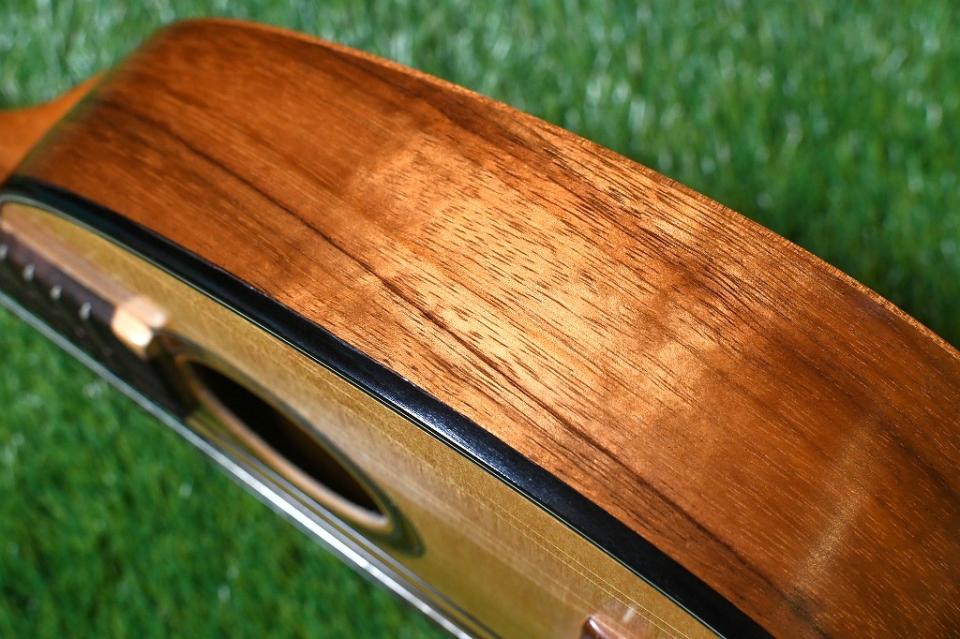 トップは針葉樹系の材、サイドバックにはハワイアンコアを使用しており、前に音が飛びやすいコロコロとしたサウンドです。
