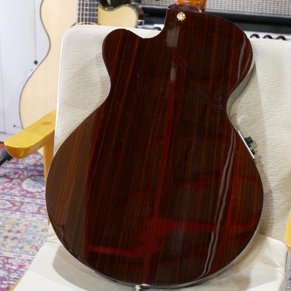 トップとバックに1000Rのアーチをかけた独特のデザインを持つこの楽器は、非常に身体にフィットする素晴らしい弾き心地を持っています。さらにボディーセンター部分に対し、サイドがソリッドボディーのエレキ程の厚みなのでハウリングにも強いという利点があります。