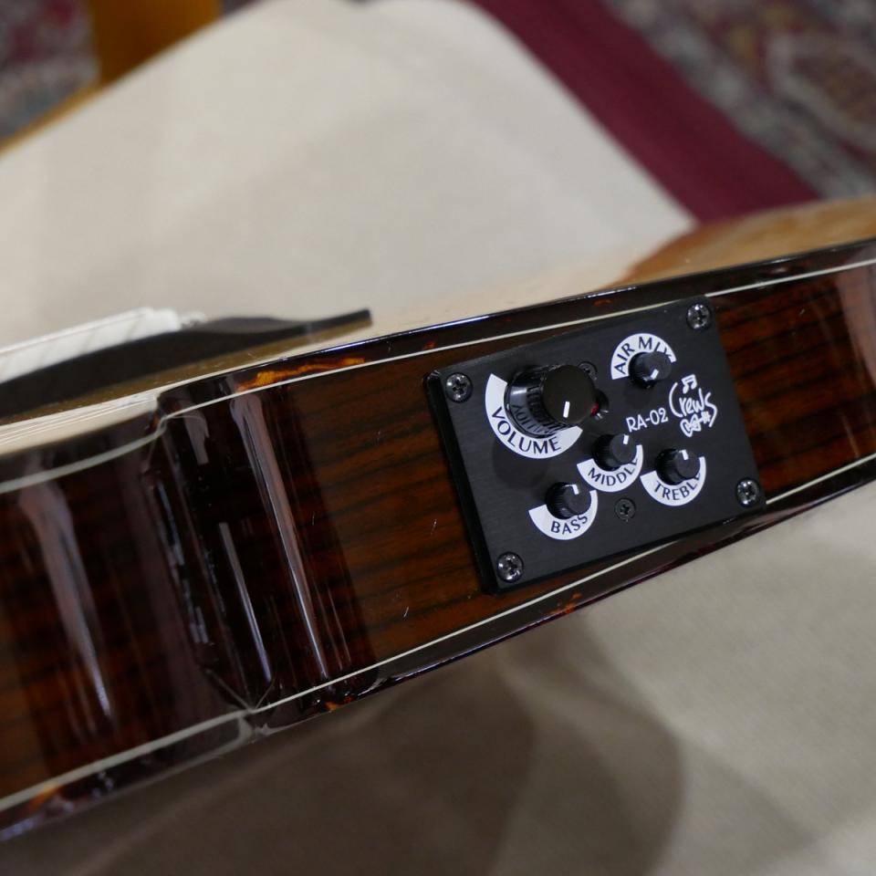搭載されたオリジナルデザインのRA-02プリアンプはボリューム、3バンドEQ、更にプリアンプ底面にマウントされたコンデンサーマイクのミックスボリュームであるAIRコントロールという、コンパクトでありながら非常にサウンドメイキングの幅が広い優れたプリアンプ。