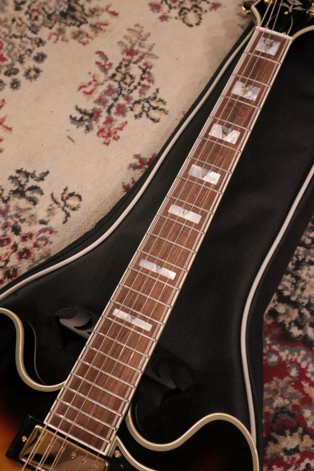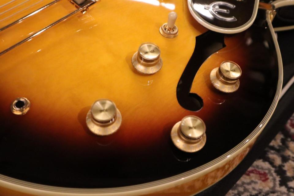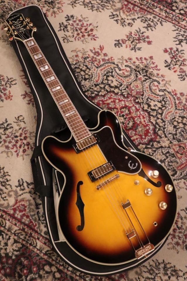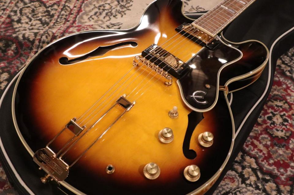 このエレガントな楽器は、レイヤード・メイプルから作られたセミホローボディが採用され、ハウリングに強いメイプルセンターブロックを備えています。22フレット仕様のネックはバインディング仕様で仕上げられ、インディアンローレル指板上ではアバロン素材によるトライアングル・インレイとマザーオブパール素材によるブロック・インレイが施されています。バインディング付きのヘッドストック上では、歴史的なエピフォンのロゴとマザーオブパールのツリーオブライフのデザインが施されています。