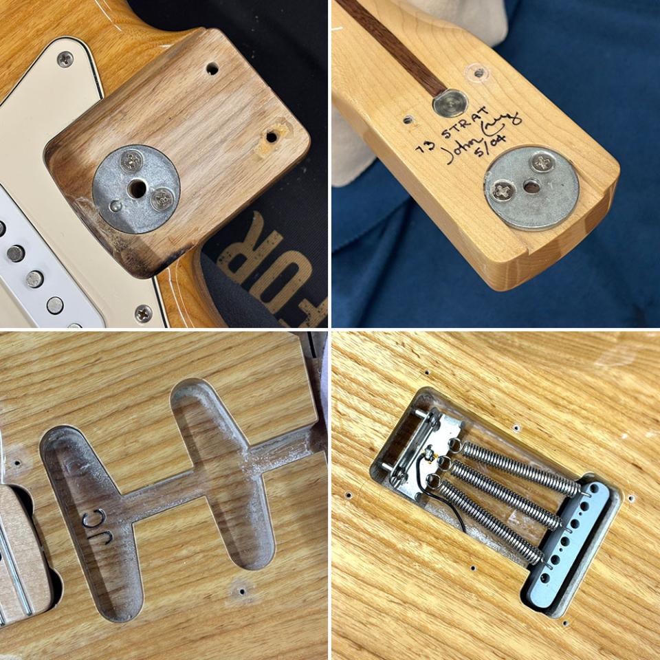 ナチュラルフィニッシュのアッシュボディに1ピースメイプルネック、ラージヘッド、ブレットナット、2ストリングガイド、3点止めジョイントプレート、Fキーチューナー、スタガードポールピースetc...1973年のストラトキャスターの仕様を再現した一本。ピックアップは現在は第一線を引退してしまったPUマイスター“Abigail Ybarra(アビゲイル・イバラ)”氏によるハンドワウンドPUを搭載しています。