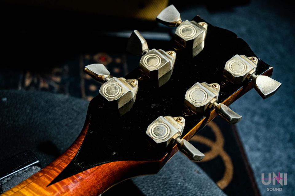 マルチバインディング、エボニーフィンガーボード、ブロックインレイ、 ゴールドハードウェアなど、一見するからにプレミアムな仕様のギターです。