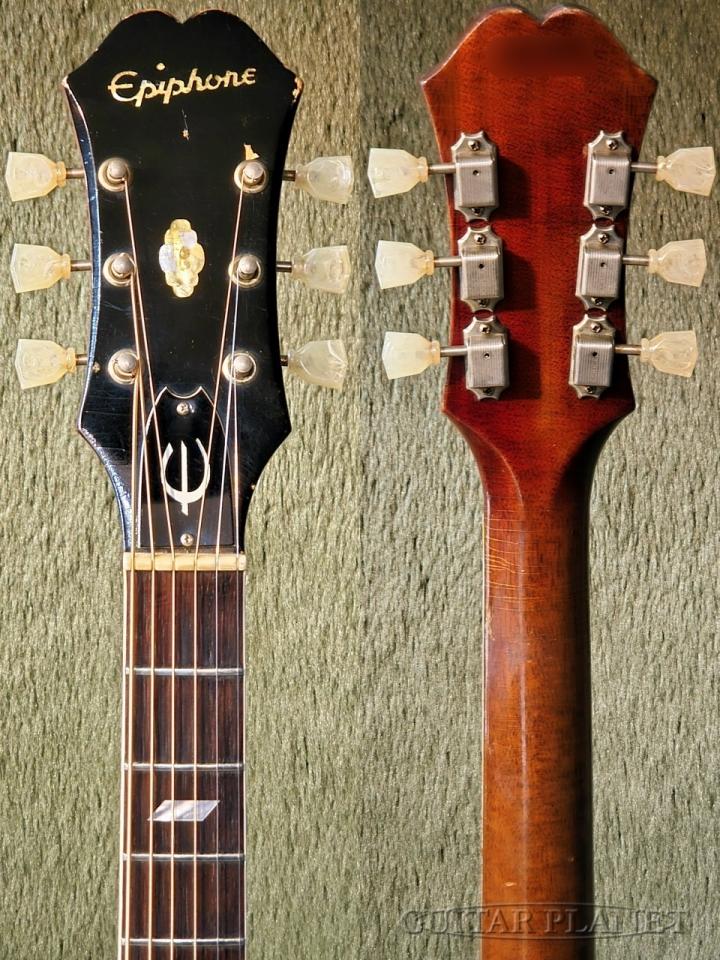 目の詰まった美しいハカランダ指板や特徴的なピックガード、コンターの入ったヘッドサイドなどギブソン製でありながら独自の魅力がある60年代のエピフォン。