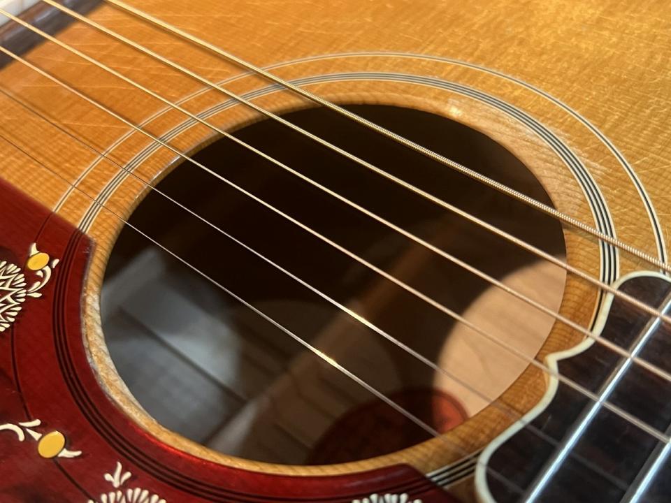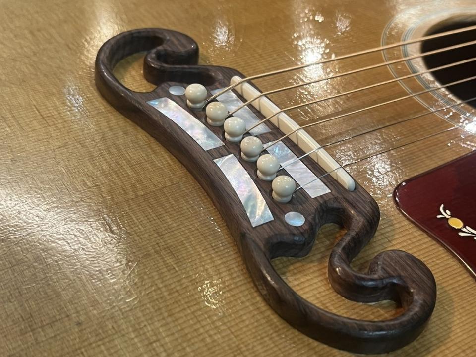 マスタッシュ(口髭)ブリッジに当時と同様の4枚のパールプレートやエングレイブドされたフラワーパターンのピックガード、指板のサンライズインレイとSJ-200には欠かせない特徴的な部分をしっかりと押さえております。