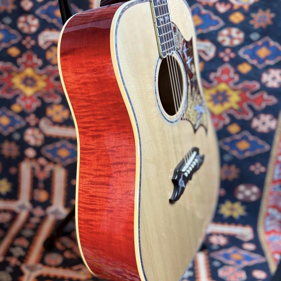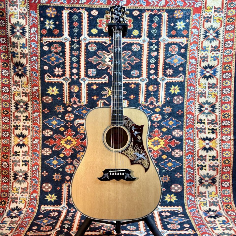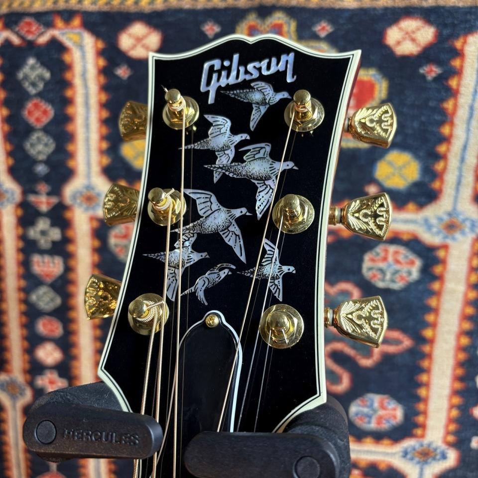 28羽分のエングレーヴされたダヴ(鳩)のインレイが埋め込まれています。ヘッドストック上に7羽、指板上に16羽、ピックガード上に3羽、そしてブリッジベース上に2羽であり、それぞれが別々の表情をしている点が魅力です。