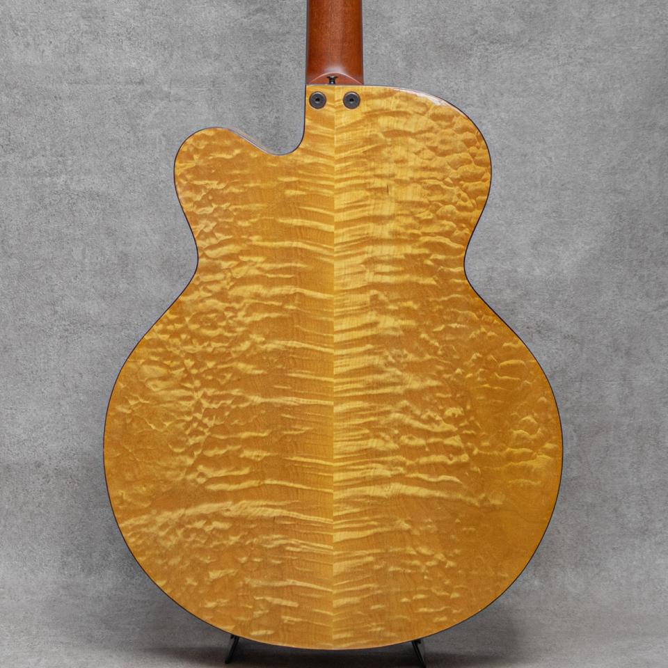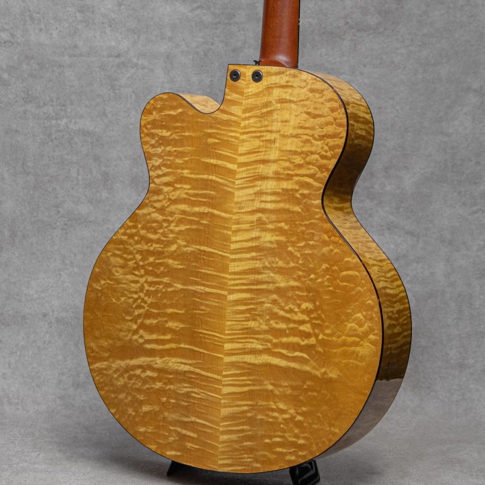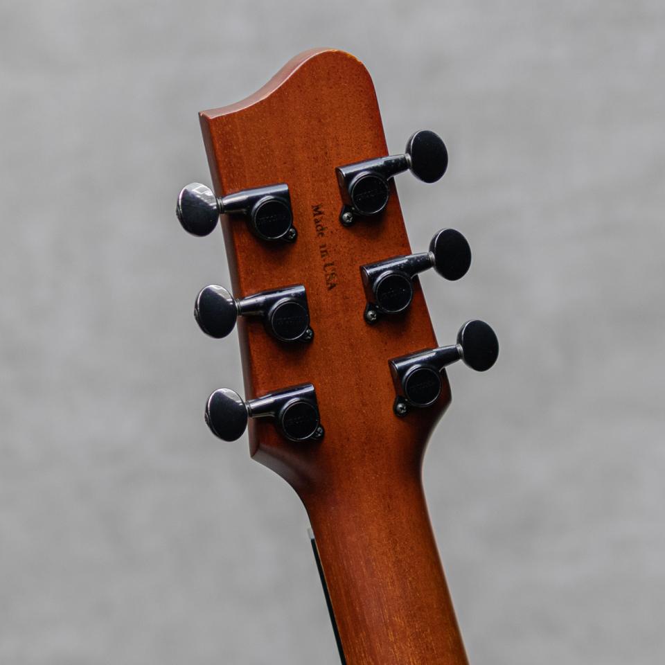 ワシントン州タコマにて1991年に創立されたアメリカのギターブランド"タコマギター"。2008年の工場閉鎖までには国内外を含め多くのプロミュージシャンに支持された著名ブランドのひとつ。本器は同社Baritone Guitarモデルのラインナップ上位モデルの"BF28C Thunderhawk”。29"スケールを持つBチューニングのバリトンギターモデル。2004年製極上USED品。ベアクロウ杢の浮き出るスプルーストップ、ゴージャスなフィギュアド杢が眩いメイプルサイド&バック、マホガニーボルトオンネック、エボニー指板&ブリッジ、オフセットサウンドホール、ゴトー製ブラックペグ、べっ甲柄セルロイドバインディング、カッタウェイ。後付けでL.R.Baggs i-Beam Activeピックアップが搭載されています。迫力の重低音、そしてそれに折り重なるサウンド。バリトンギターならではの重厚かつ彩りのある響きは、プレイヤーの創造力を掻き立てます。通常じょうの演奏を5度低いチューニングでプレイするだけでも全く異なる世界観をもたらしてくれ、オープンチューニングなどを駆使すると唯一無二の無限の可能性が広がります。大きく目立つ使用感もなく、経年から鑑みるととても良いコンディションを保っている本気。またバリトンギターやアコースティックベースなどはトップが負けて大きく膨らむものも見られますが、ネック・トップ共にエクセレントコンディションを保っています。またとても弾きやすいアクションで、サドルマージンもしっかりと残しています。使用用途や活躍の場など、まだまだ発展途上な楽器のバリトンギター。選べる種類も少ない独特な存在ですが、その可能性はまさに未知数。積極的に創造して音楽を奏でてください。なかなか出回らない上位モデルのサンダーホーク、お見逃しなく。。ハードケース付属。使用弦はLaBella BG-M/15-80を使用しています。