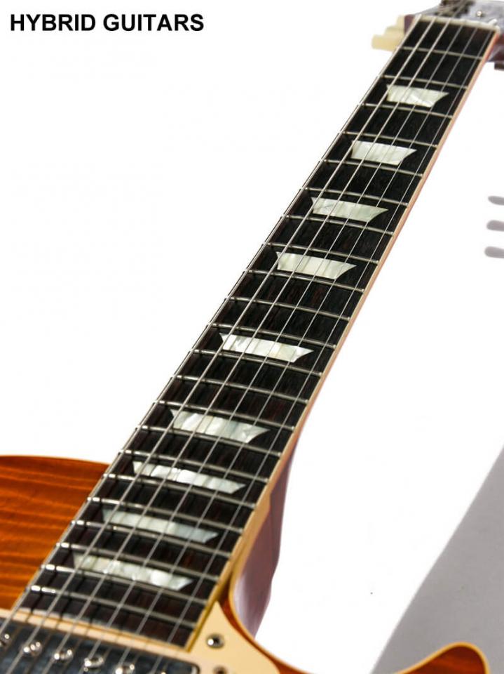 本機はボディトップにFigured Maple、ボディバックとネックにMahogany、指板にはRosewood、10inchの指板ラディアスを採用しています。ピックアップにはGibson Custom Bucker Setを搭載しています。
