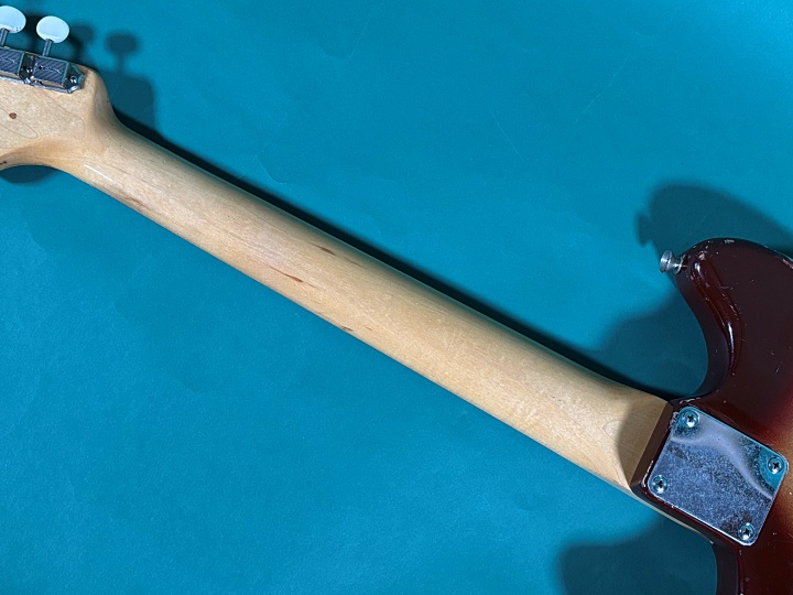 デカールがMUSIC MASTERになっております。新品時からのイレギュラー、もしくは後から貼られた可能性もありますが自然な感じです。1弦ペグが曲がってますが動作に問題はございません。ネックプレートは交換されております。PUリード線には継足しがあり、POTはVOL、TONE共に近年もののCTS製に交換されており、コンデンサも交換されております。ジャックはスイッチクラフト製に交換されております。楽器は全体的に打痕や塗装ハゲがあり、長年使い込まれてきた楽器らしい風格のあるルックスです。