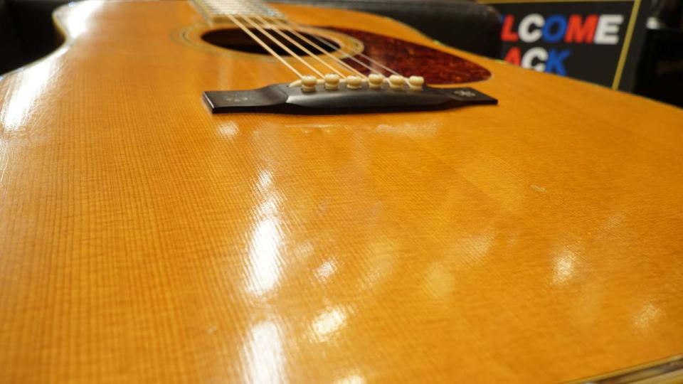 サウンド面では、12フレットジョイントとスロープショルダーボディの組み合わせにより、開放弦の響きが伸びやかで、ローからハイまで豊かな倍音が広がるように設計されています。指弾きでは繊細に、ストロークでは力強く応えてくれる、表現力豊かな一本です。特に中低域のふくらみと煌びやかな高域のバランスは、同時代の量産モデルでは得難い魅力といえるでしょう。