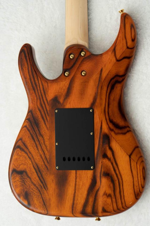 今回入荷したモデルは、ボディトップに希少材のマーブルウッドを採用し、ボディバックにはバーナー加工を施したアッシュ材、指板にはローズウッド材を採用しました。