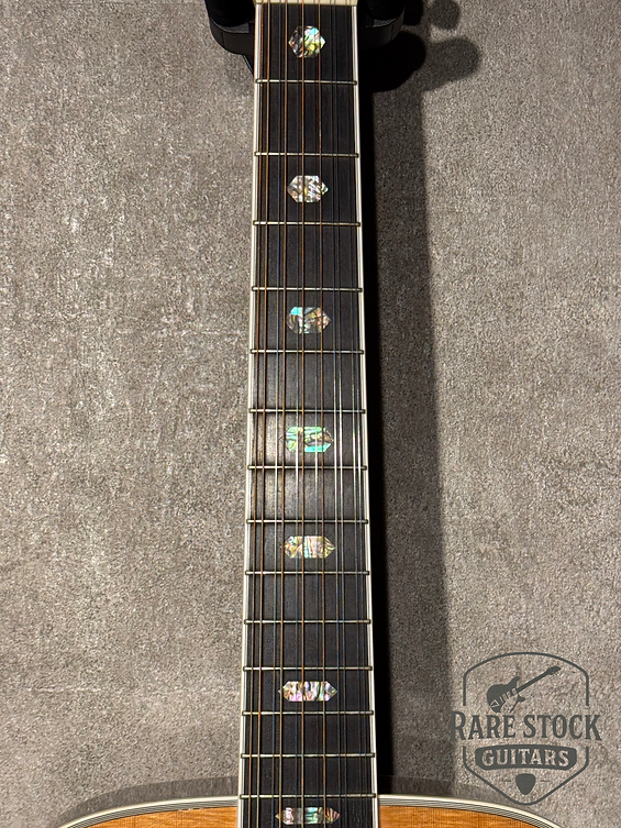 指板はアバロンによるヘキサゴンインレイと漆黒のエボニー ネックにも目の詰まった良質なマホガニーが与えられ、12弦の強いテンション感にも動じない強度なネックを備えています。