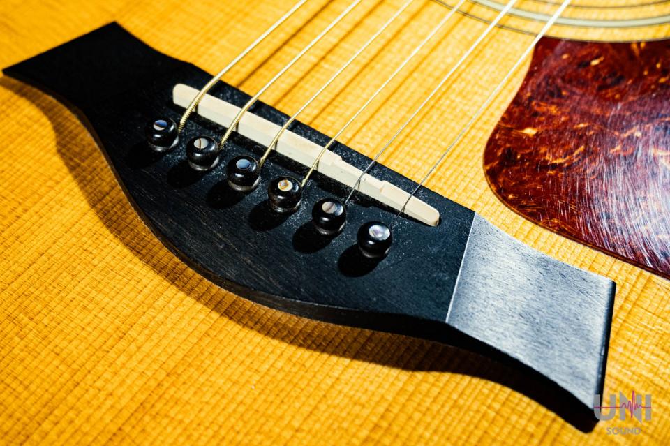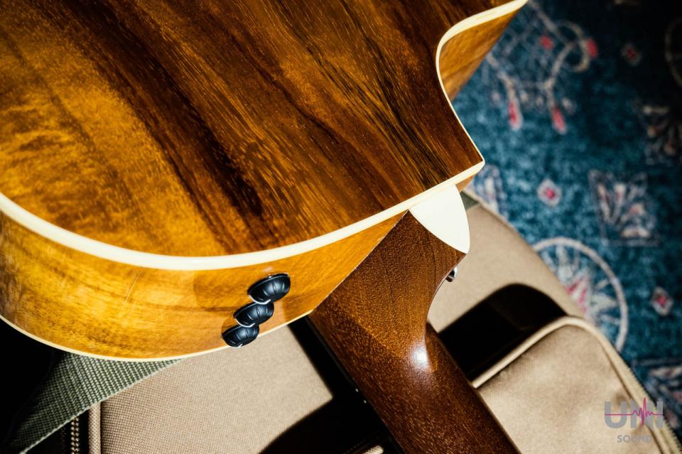 カッタウェイの入ったグランド・オーディトリアム・シェイプを採用し、ハイポジションまで演奏性の良いエレアコ仕様でTaylorオリジナルピックアップES1を搭載し、ボディ・サイドにあるボリューム、ベース、トレブルのコントロールで調整可能です。