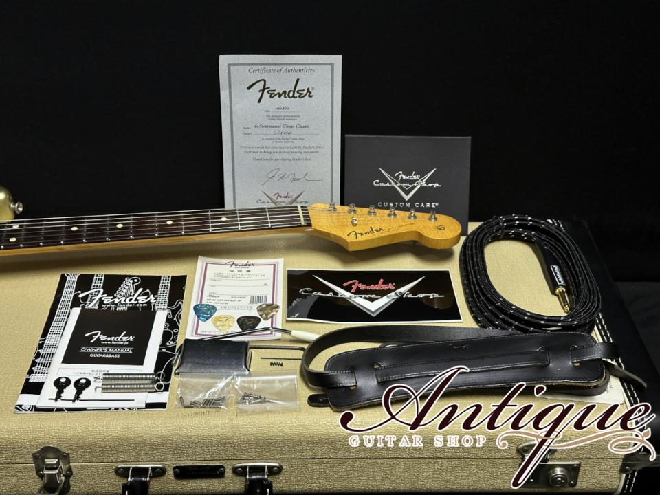 また最後にコンディションですが、こちら前所有者様がコレクション重視にて大切に所有されていた為、15年前の製作品であるに関わらず殆ど使用感の無い極上コンディションをキープしております。厳密に言えばボディサイド(ボディバック左端)に非常に浅い打痕が見受けられますが、その他目立ったスクラッチ等もなく、年式を考慮すればミントコンディションと呼ぶに相応しい素晴らしい状態です。プレイ面においてもネックコンディションは良好でトラスの余裕も左右ともにシッカリと残っており、フレットに至ってはヴィンテージタイプにて元々背の高いタイプではありませんが、目立った減りも無く9部山以上残っております。付属品についてもバックパネルを除き、認定書を含む一式が揃っており(画像参照)、ケースも特別なモデルに採用されるオリジナルのホワイトトーレックスケースが付属致します。