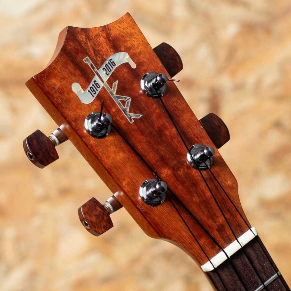 1916年にサミュエル・K・カマカが創業して以来、熟練した職人技と徹底した品質管理を誇りハワイアンウクレレメーカーのトップブランドとしての地位に君臨し続ける「カマカウクレレ」。本器はテナーサイズの”HF-3 100th” 2016年製USED品。カマカ・ウクレレ100周年記念モデルになります。ハワイアンコアボディ、マホガニーネック、ローズウッド指板&ブリッジ等、基本の仕様はそのままに、100周年記念ロゴデザインのヘッドパールインレイ、クロームカラー/スネークウッドボタンのシャーラー製ギヤペグ、半ツヤ仕上の塗装、ボディ内側の100周年記念ラベル、記念モデルならではのこだわり仕様が取り入れられております。カマカらしい独特の太さ、甘さ、深さを感じるサウンドで、素朴さ、味わいのある響きを持っております。ネックヒールにストラップピン打ち、L.R.Baggs Five-Oをインストール済でライブでの使用も可能です。その他僅かな使用キズやスレが見られる程度で大きなダメージはなく、ネックコンディションも良好。現在は中古市場でしか手に入らない人気の100周年モデル。是非この機会にお求め下さい。オリジナルハードケース付属。