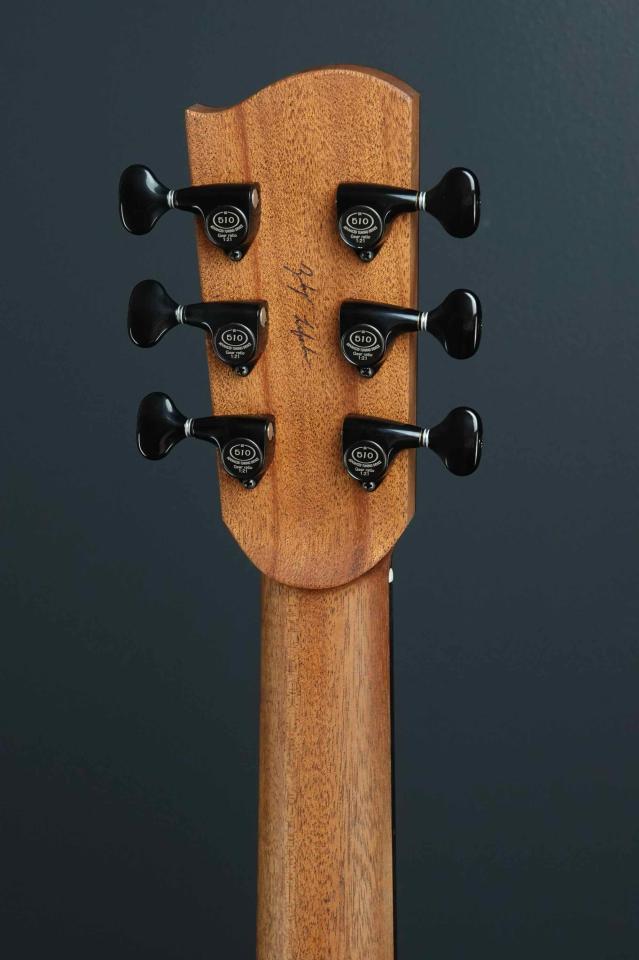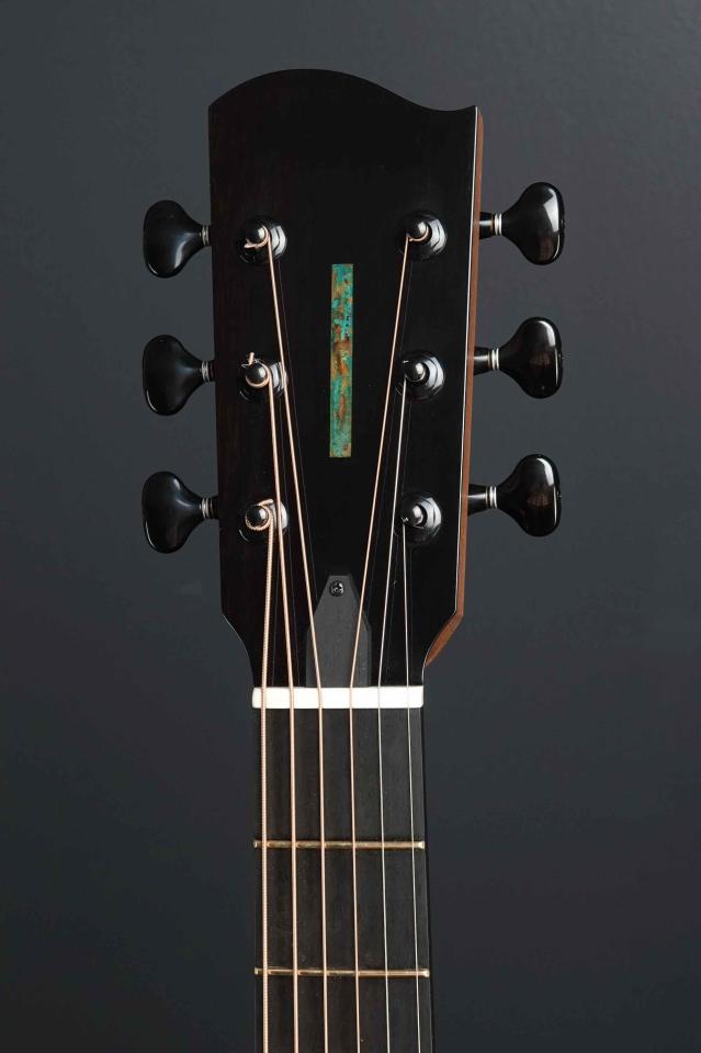 ブリッジはエボニーと間違えるほどの質感の、ロックライトというシンセティックな材料で作られています。エボニーよりも軽量で、トップのブリッジエリアをより振動させるのに有効な素材が使われています。ボディバインディングにもこのロックライトが使われており、シックで、落ち着いた上品なルックスに仕上がっています。