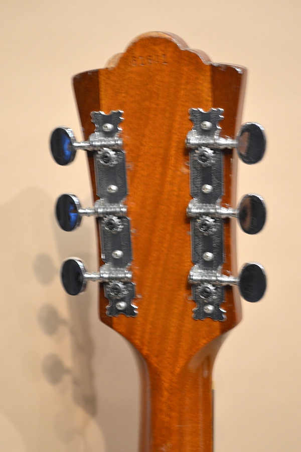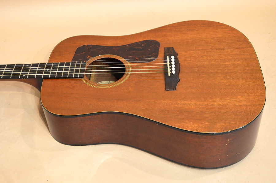 ソリッド・マホガニーTOP、ソリッド・マホガニーSIDE&BACK、ローズウッド指板&ブリッジ、実測42.5mmナット、25.5インチ・スケールのギルド・ドレッドノート・ボディー。ブレーシングなどの木取りが太く、全体的な重量が重たいのがオリジナル・ギルドの特徴で、それ故に野太くパワフルに鳴ってくれるオリジナル・ギルド・サウンドは、この時代のものならではの醍醐味です!