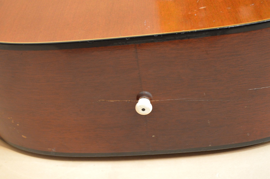 楽器のコンディションは、キズの類は少なく、全体的に見ればかなりの美品コンディションですが、いくつかのクラック修理があります。まずギターをドンッと思いっきり置いてしまったのでしょう、ボディー・エンドのエンドピンを中心に左右に10cmほどクラックが入り接着修理されています。また、バックの6弦側エンド部から9cm程クラックが入り接着修理されています。エンド部のクラックはクリートが1つしか打たれていませんが、しっかり接着されています。バックのクラックにはしっかりクリートが打たれていますので、こちらも強度的な心配はありません。その他には小キズ程度は散見出来ますが、トータルで判断すれば年式の割には相当綺麗なコンディションと言えるでしょう。ペグは現在はオリジナルのペグに戻っていますが、途中他のペグに交換していた時期があるようで、ヘッド裏にペグ穴を埋めた跡が確認出来ます。