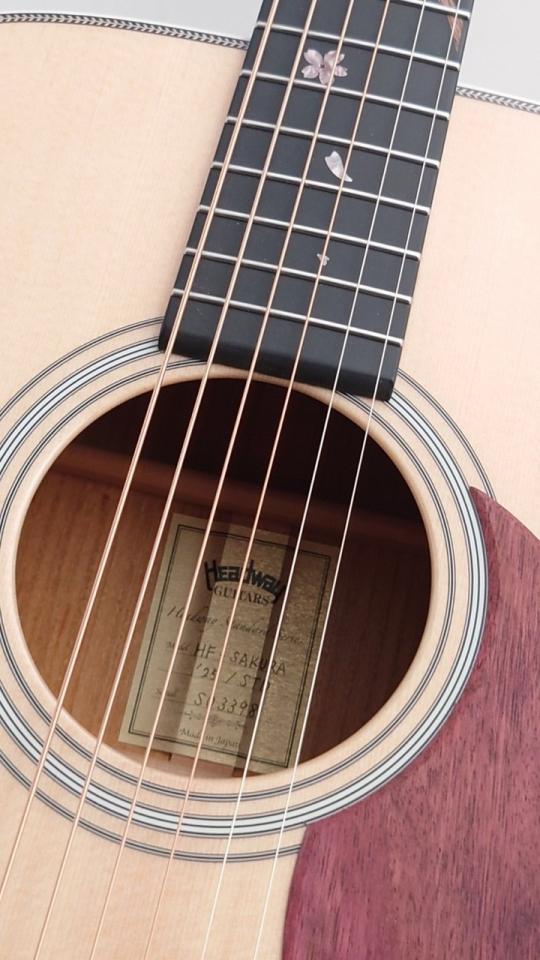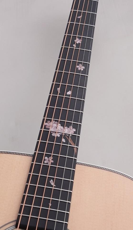 桜の花びらを模ったインレイが指板を美しく彩ります。通常のポジションマークをもつギターから持ち替えても違和感の少ないよう、演奏性にも配慮されたデザインです。