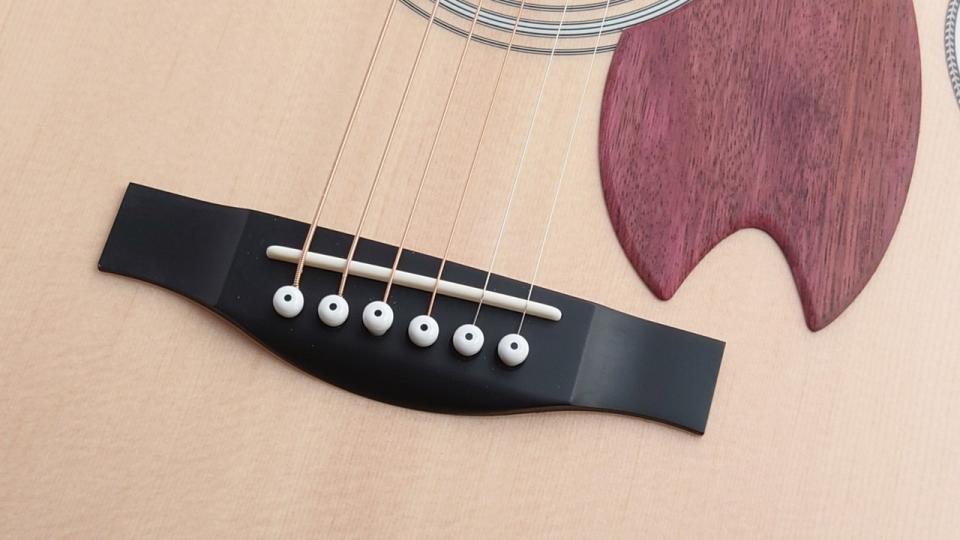 Headwayマスタービルダーの百瀬恭夫が1934年製のビンテージギターのブレーシングを研究し、独自に発展させたブレーシングを継承。Xのクロス位置がサウンドホールに近いセミフォワードシフトで新品時より低音の反応がよく、ボリュームのある鳴りを持ちます。フォワードシフトよりも5mmほどブリッジ寄りになっていることにより、トップ板の安定性も考慮された設計が行われています。