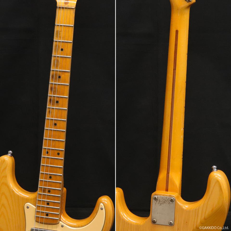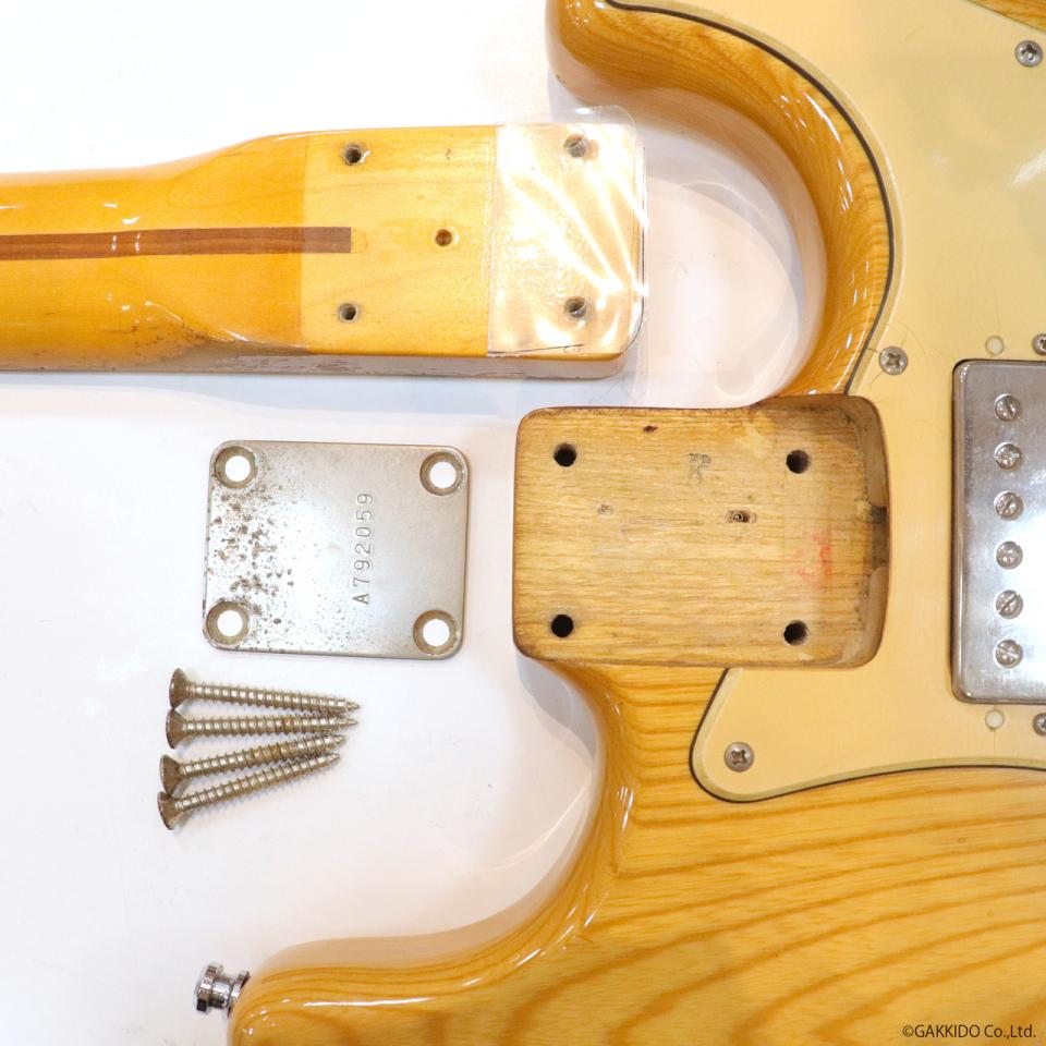 ネックは1ピースのメイプルネックで、ヘッドはリフィニッシュによりロゴのない状態となっていますが、ペグはグレコの6連ペグ、ネックプレートもシリアル刻印などから当時のグレコと思われるものが装備。ジョイントにはプラ板のシムが仕込まれています。