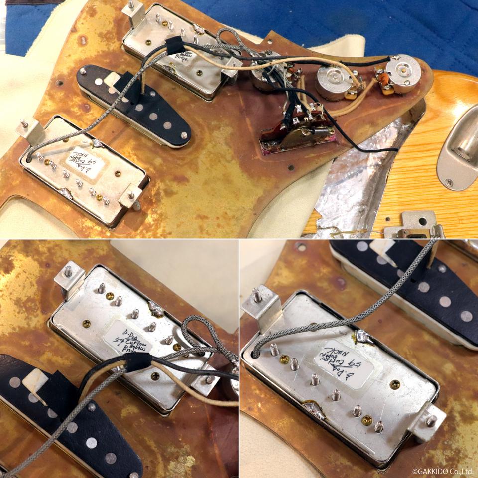改造によりHSH配列へと変更されているストラトタイプのギター。元々は3S配列だったようですがフロント、リアにGrinning Dogの59Custom Bobbinピックアップが搭載されています。