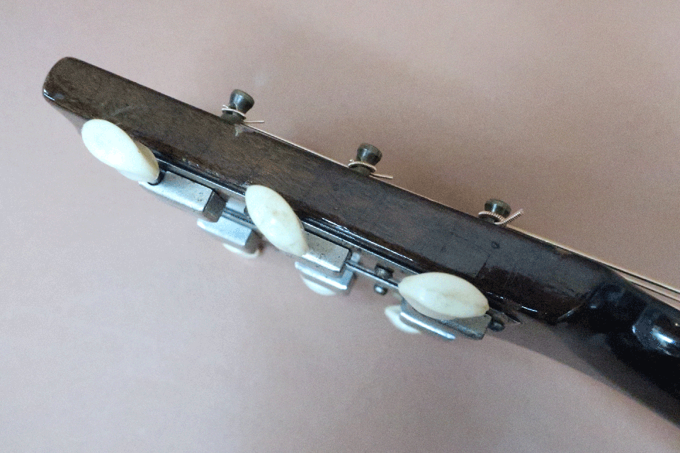 1940年代の雰囲気を継承したスモールピックガード期の希少モデル。テーパーヘッド、ハカランダ指板&ブリッジ、ワンリング・ロゼッタ、ノーマルサドル、スモールピックガード、オリジナル・チップボードケース付