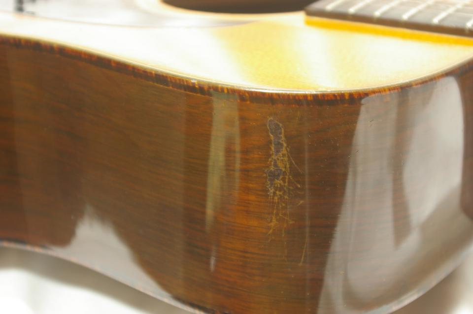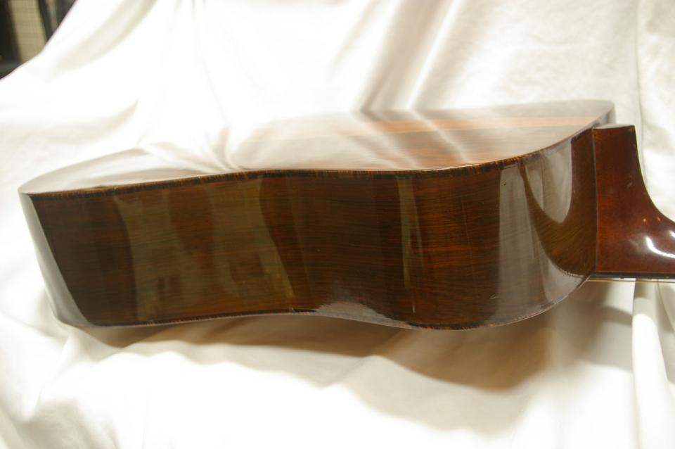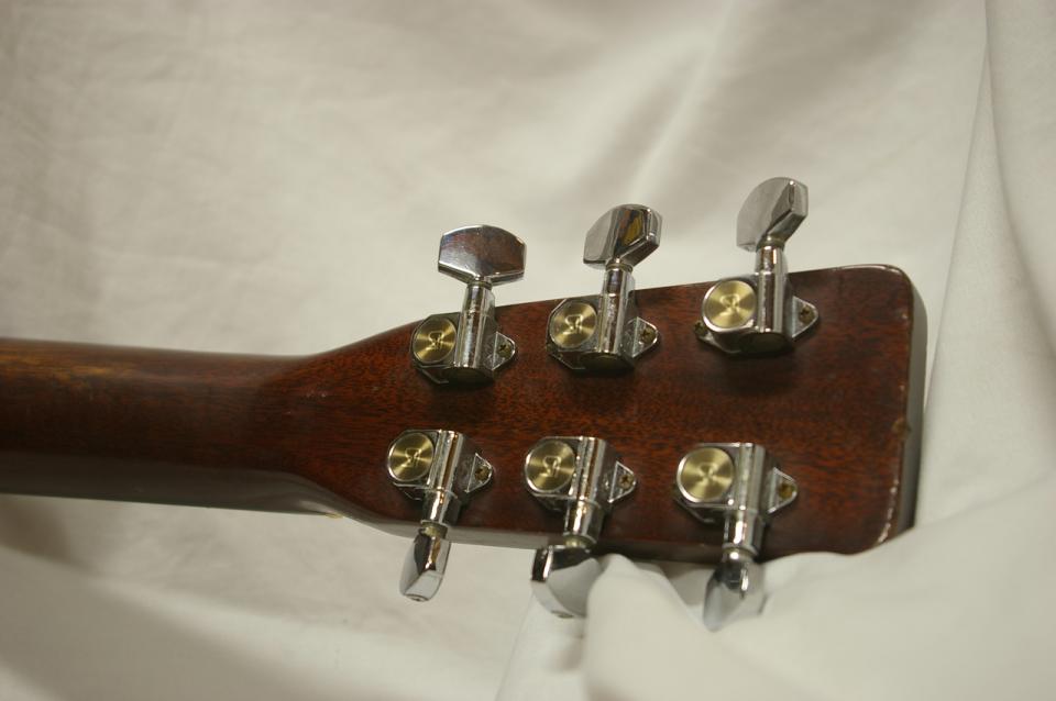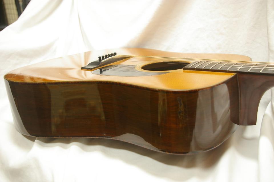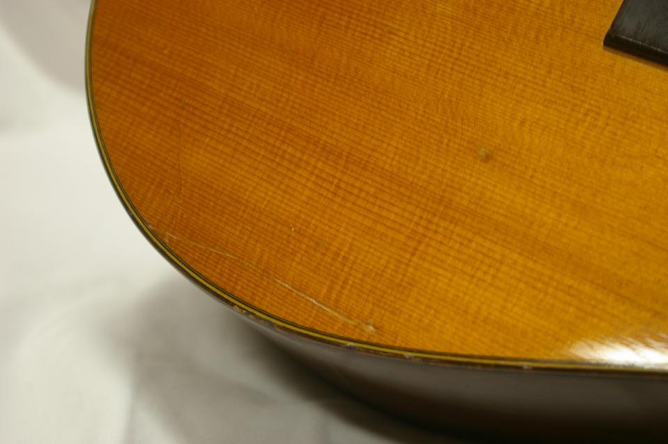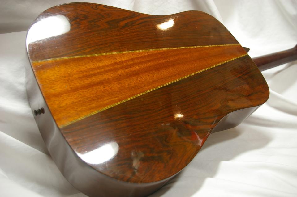 初期型の本機はスプルーストップ単板、サイドがハカランダ、バックがハカランダ・マホガニーの3P仕様、指板・ブリッジがエボニーでペグがゴトー製のもの。