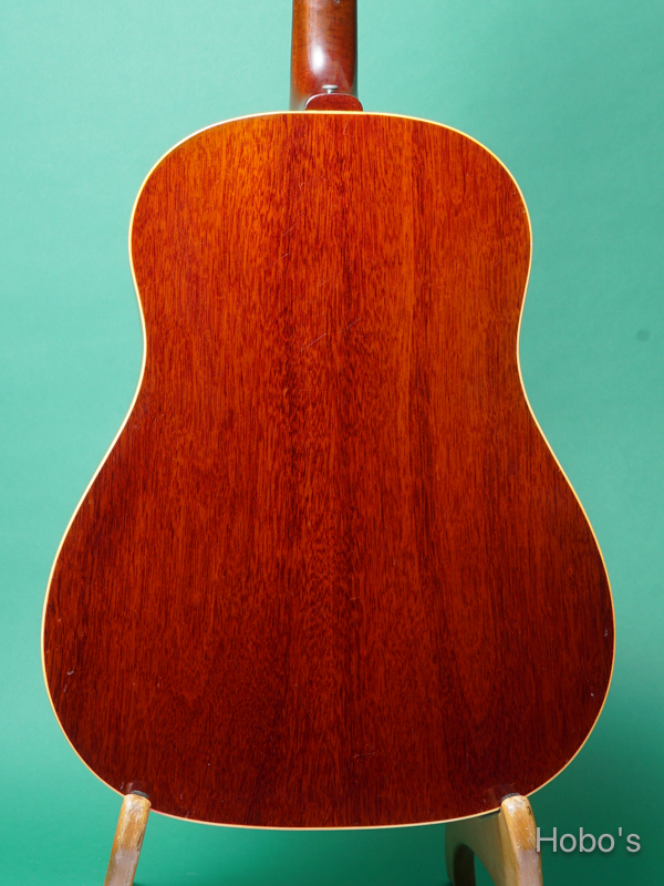 フレット及びサドルの高さにも余裕があり、ネックコンディションも良好です。表板には日焼けやウェザーチェック、並びに小キズや打痕が年式相応に見られ、サウンドホールには軽微な弾き削れがございますが、クラックはございません。ネックヒールへのストラップピン装着はございますが、エンドピンジャック加工跡はなく、年式を考慮してもオリジナル性高く、コンディション良好な個体と言えるでしょう。入荷時に当工房にて、ナット新規製作ならびにブリッジプレートの補修をオリジナル・チューナー、ピックガード、ブリッジ、フィンガーボード、フィニッシュ。純正チップボードケースが付属致します。