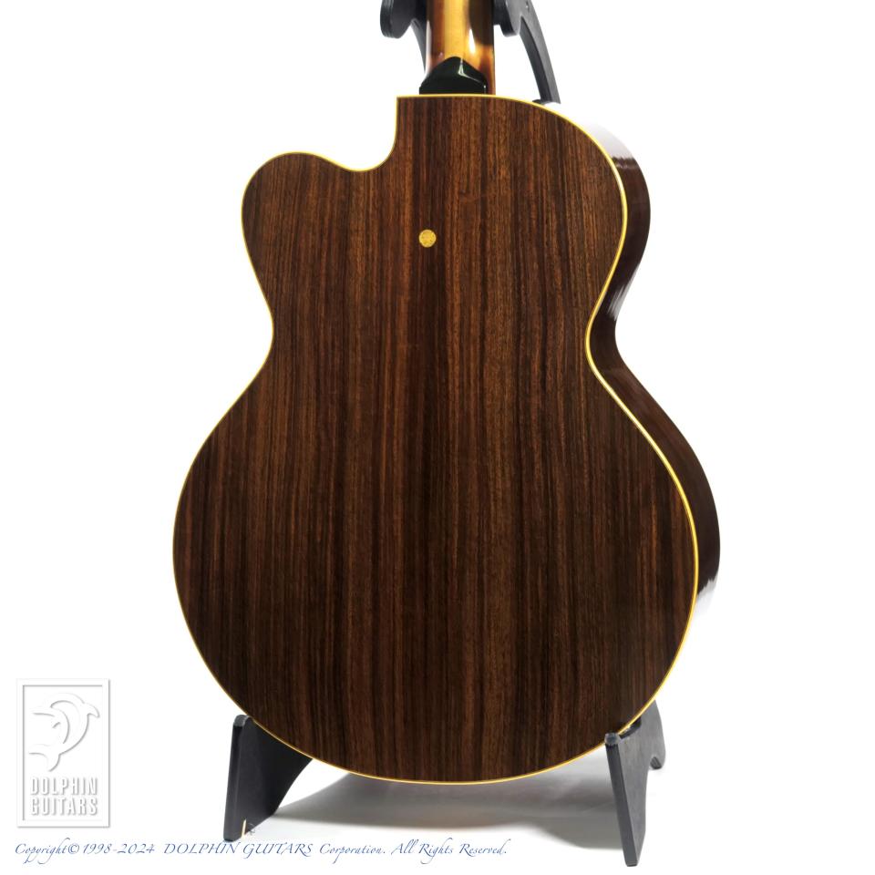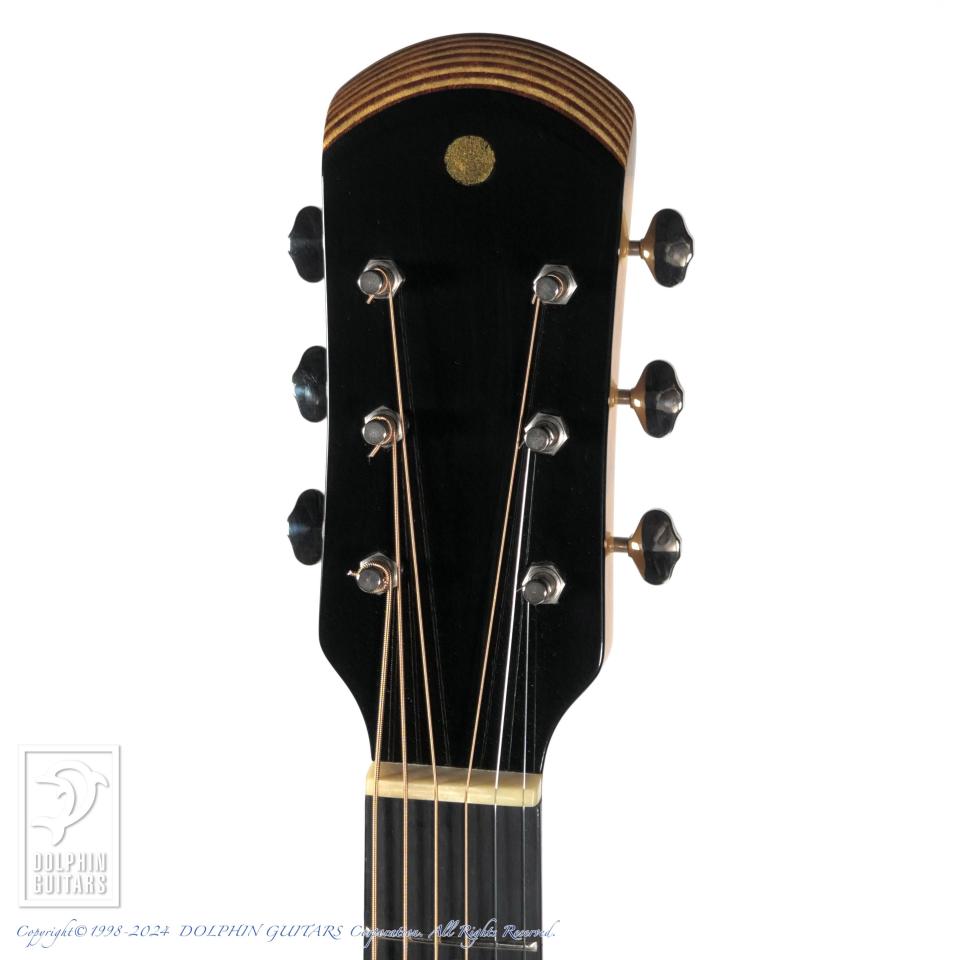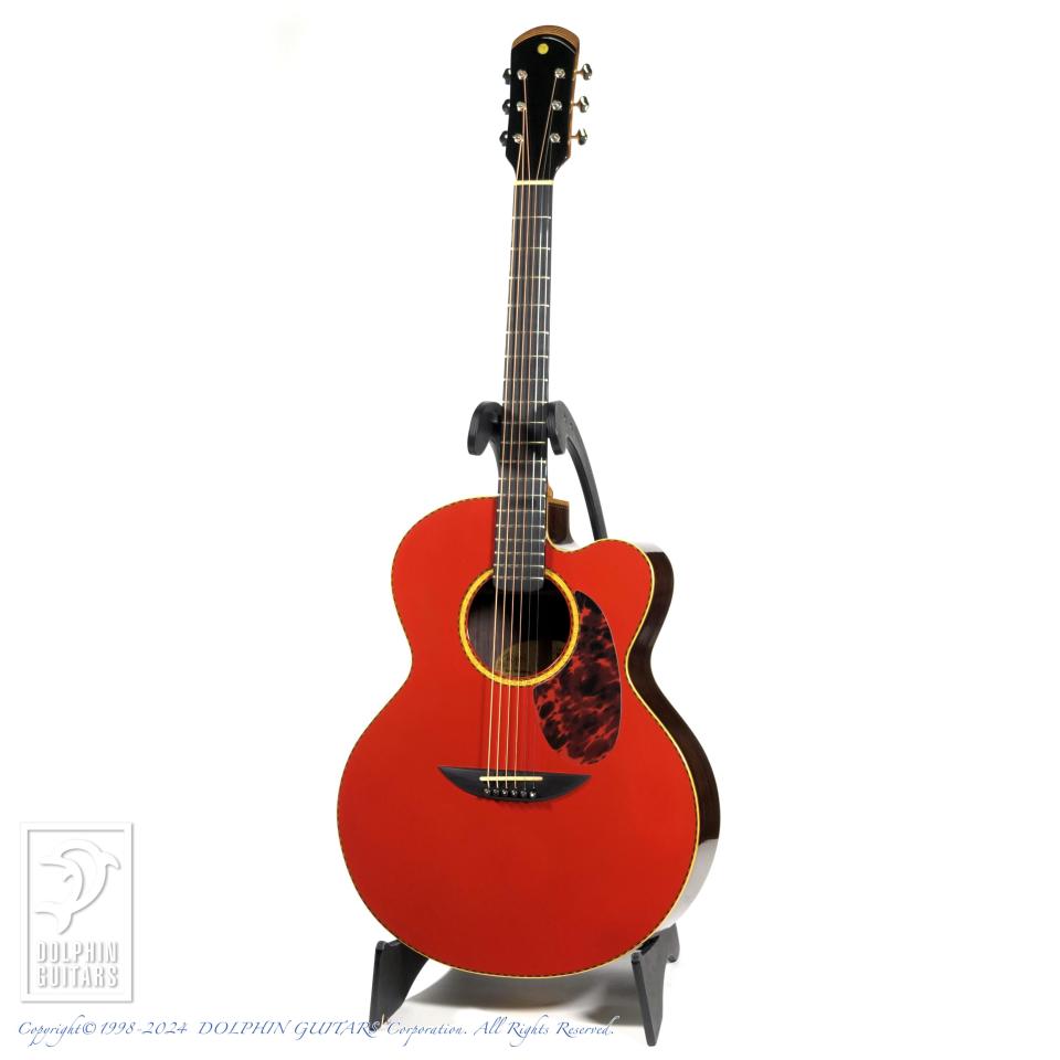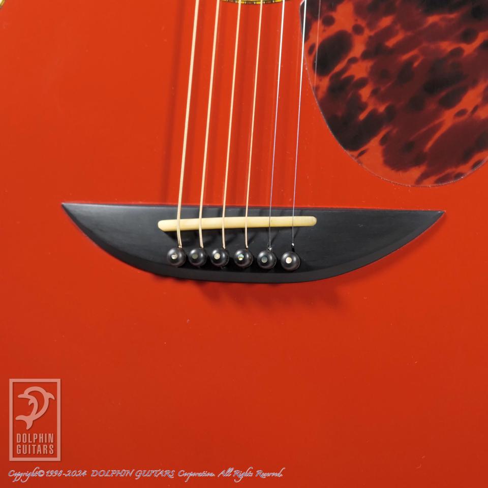 シダートップと厳選されたインディアンローズウッドのボディにネックは、フィンランド産のアスペン(ポプラ)を使用、赤いトップにヘッドやサイドマーク、ロゼッタに入れられた金箔などなど、斬新なデティールが目を惹く一本です。