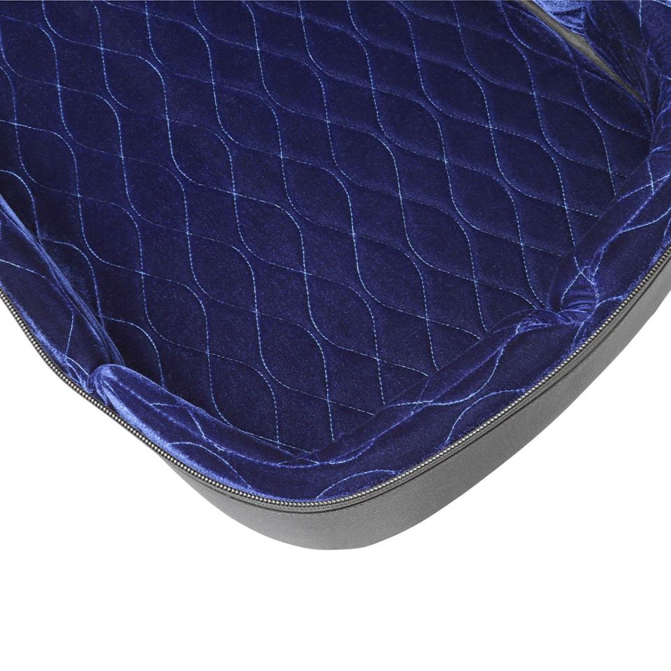 Oxford シリーズはデザイン性にも優れています。特徴的なダークグレーの外装にシェブロン柄のキルティングを施し、内装には高級感のあるブルーのベルベット素材を使用しています。