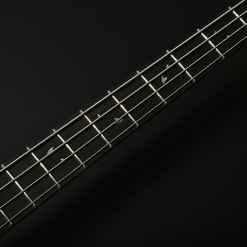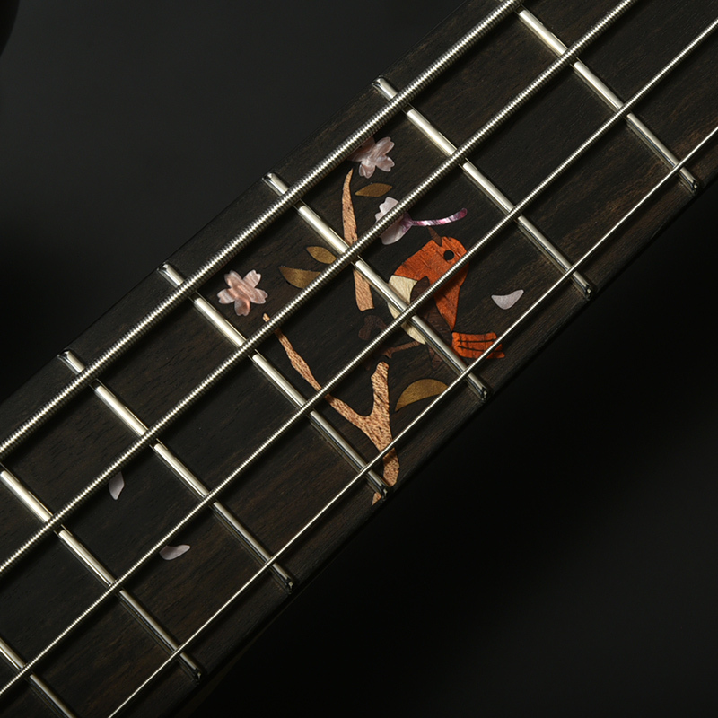 指板にも巧みなインレイワークにより、舞い落ちる桜を色彩豊かに表現。