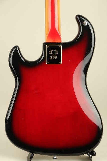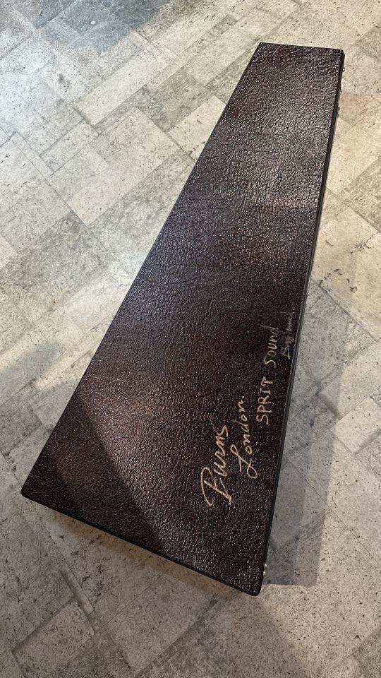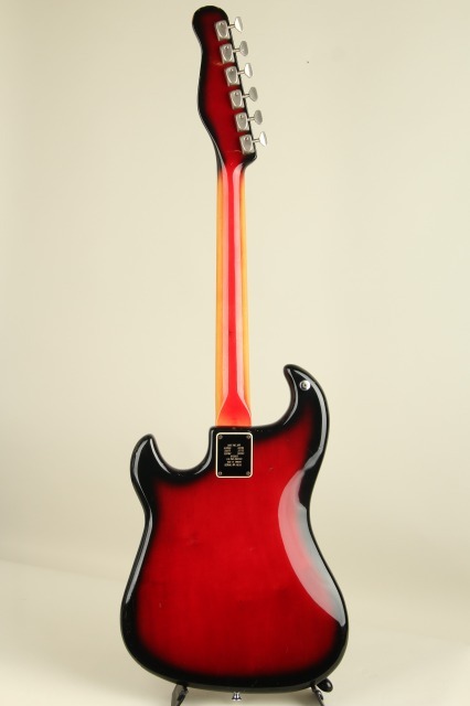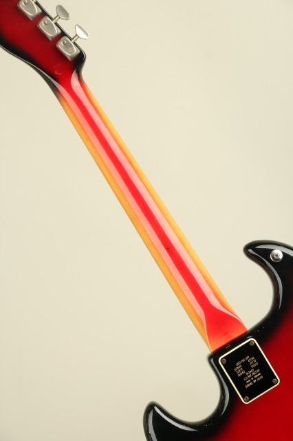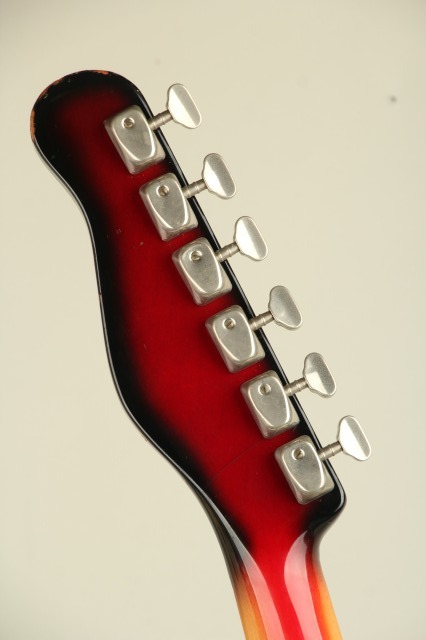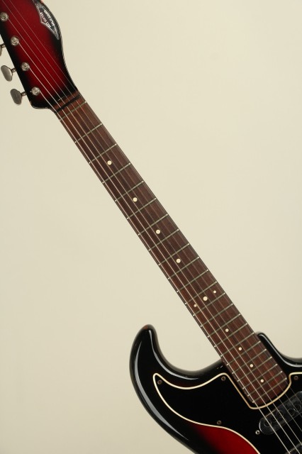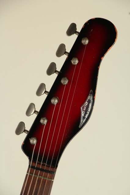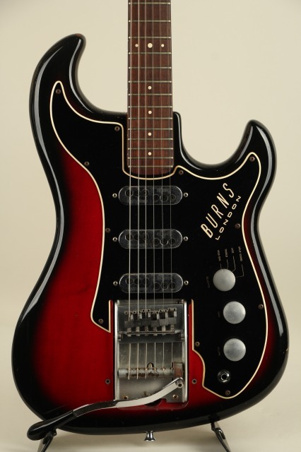 1959年にイギリスに生まれたBurns Londonはアリス・ルイーズ・ファレルとジェームズ・オームストン(ジム)・バーンズによって設立されました。エレキギター黎明期において、現代のような"王道"スタイルがまだ確立されていなかった時流、数多くのプロダクトが次世代のスタンダードたる可能性を秘めて登場し、その中でも一際異色な存在感を示したブランドがBurns Londonでした。1965年には老舗ボールドウィン・ピアノ&オルガン・カンパニーによって買収され、社名は”ボールドウィン・バーンズ”に改まることとなります。アメリカ最大の鍵盤メーカーであったボールドウィンは、それ以前にフェンダー社の買収を試みたりなどLMマーケットへの参入に積極的であったものの、ピアノ小売店でのギター展開は軌道に乗らず、60年代後半には新しく傘下としたグレッチのギターとドラムの取り扱いに注力をすることとなり、バーンズブランドは縮小、1970年に生産が終了しました。本器”Jazz Split Sound”は62年に登場。63~65年にはアメリカ流通モデルが"Ampeg"ブランドにて販売され、65年以降は"Baldwin"ブランド表記となりヘッド形状も変更されます。当ブランドの代表作であると同時に、その銘の変遷にも栄枯の体現を感じさせるメランコリックなモデル。こちらは62年~65年の間、イギリス国内で販売がされたであろう"Burns"表記、本流の一本。ポットデイト等の確認ができず明確な判断は難しいところですが、シリアルより63年頃の製造と考えられます。当モデルを唯一無二の物としている大きな特徴は、低音弦側と高音弦側にコイルが分かれたユニークなピックアップと4段階のアウトプットセレクト、そしてかなり独特な動きをする(そしてかなり不思議な弦交換が必要となる)独創性あふれるトレモロユニット/ブリッジです。分離された信号を取り出せるピックアップは、コントロールのロータリースイッチで4モードのサウンドを出力。それぞれ《WILD DOG:センター+リア フェイズ・アウト》《TREBLE:センター》《JAZZ:フロント》《SPLIT SOUND:1から3弦リア+4から6弦フロント》のアウトプットプリセットとなっております。ブリッジはローラーで挟まれた底部がボディ上、中空に浮く設計で独特の滑らかな操作性です。