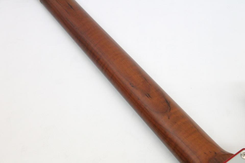 ローステッドメイプルとはメイプルを高温で加熱処理して材の中の水分や油分を揮発させることにより木材を経年変化した状態に人工的に近づけた材のことです。経年劣化が進んだ材は歪みやねじれが生じにくくなります。ネックに使用されるとその効果は安定性だけでなくサウンドにも及び、豊かな生鳴りと経年変化したビンテージのようなこなれたトーンを生み出します。一般的に高級機種などで用いられる材ですが、手に取りやすい価格帯に落とし込むことに成功しました。