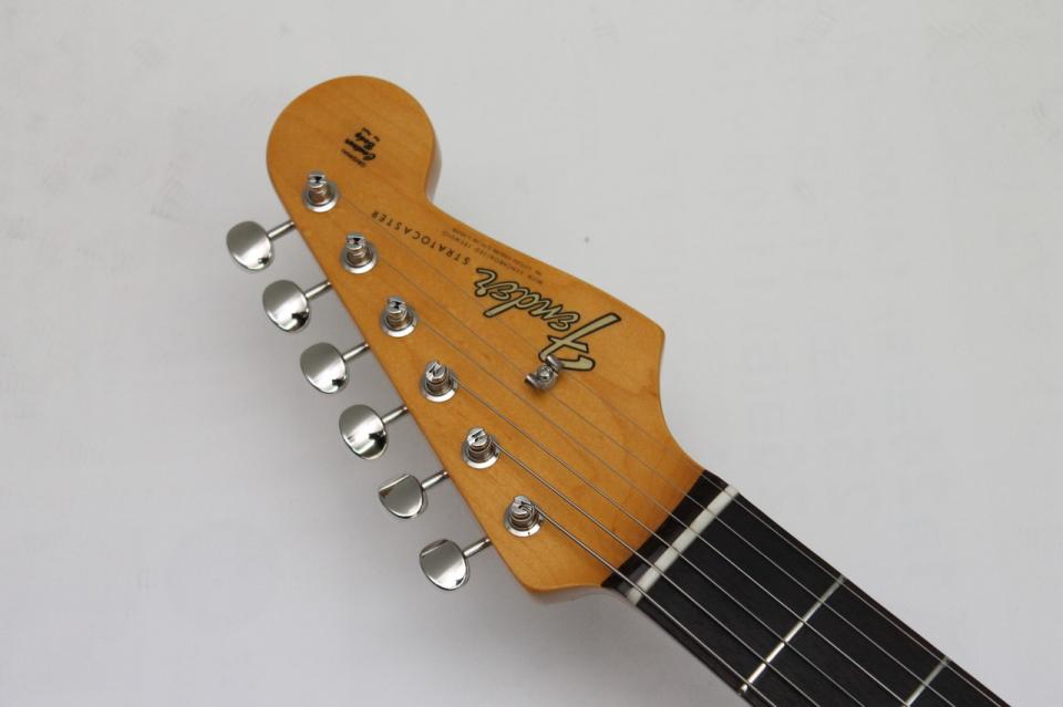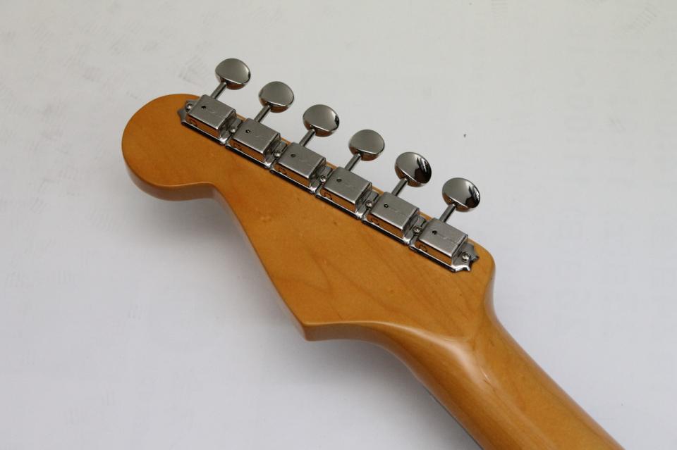 1965 “C”シェイプメイプルネックに、大きめのパールドットインレイを採用したラウンドラミネイトローズウッド指板を備えているのが最大の特徴です。