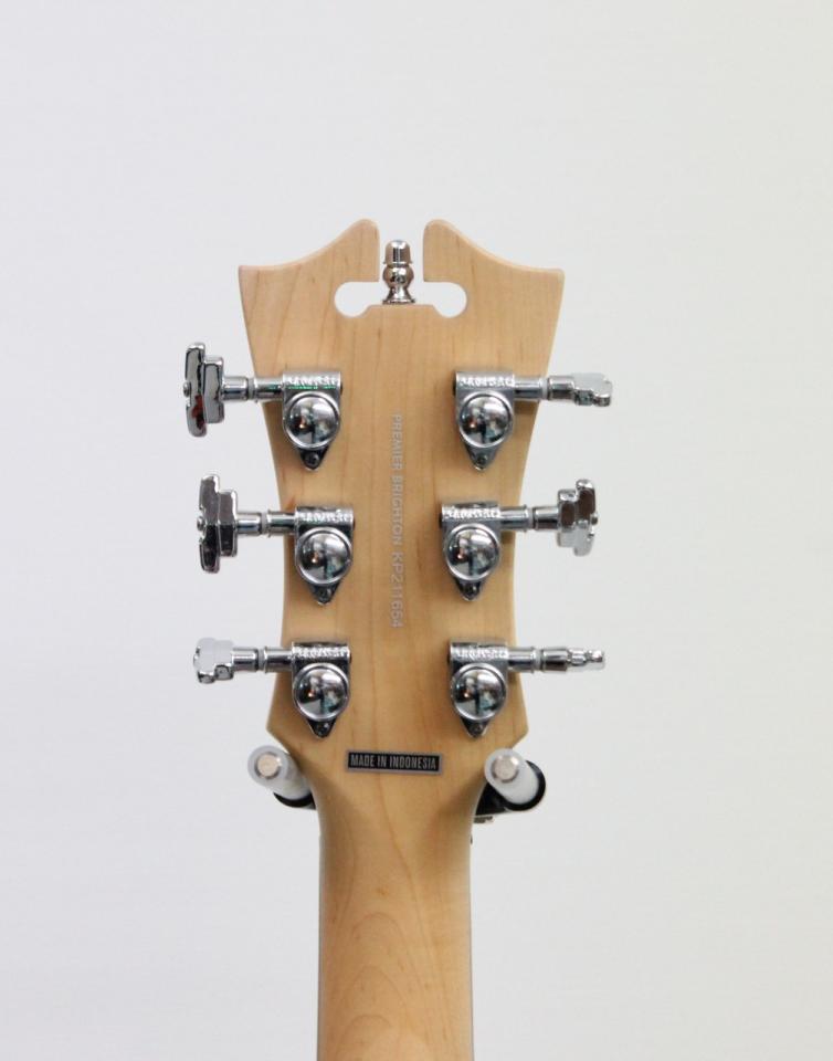 Premier Brighton Sky Blue Top, Natural Mahogany Back and Sideは、オリジナルの13.25インチ(336.55mm)幅のダブル・カッタウェイ・シェイプにエスカッションを用いてハムバッカー・ピックアップを2基搭載したモデルです。