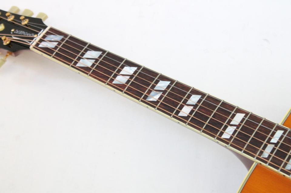 表面板はシトカスプルース。横裏板はマホガニー、そして特徴的なハチドリの3ポインテッド・ピックガード(絵柄彫り込みタイプ)にスクエアショルダーが特徴的な往年の名器です!