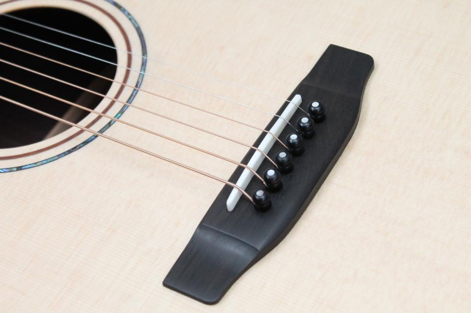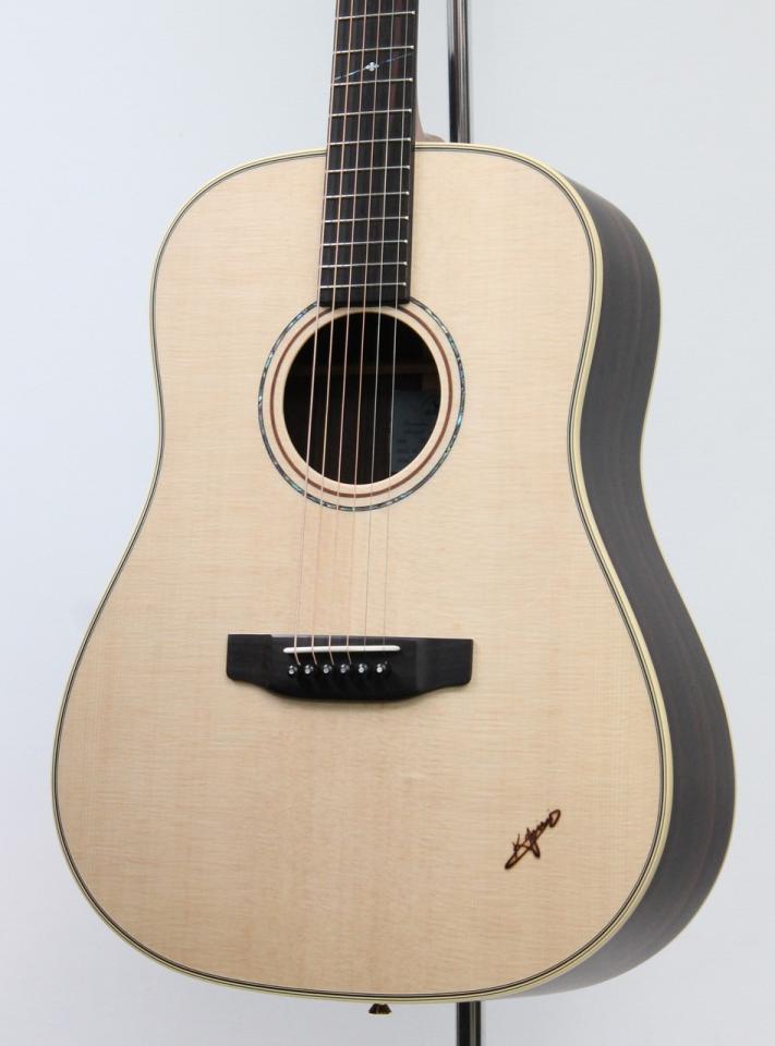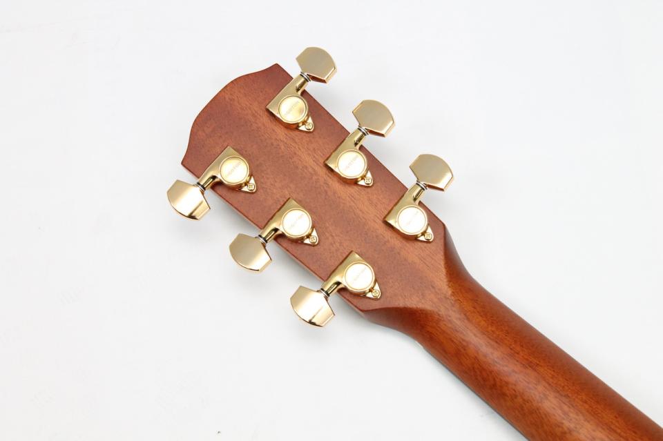 さらっとした質感のマットな仕上げ、クリアのピックガード、サウンドホール周りを縁取るさりげないアヴァロン貝の装飾など、派手さはありませんが、そのシンプルさがかえってギター自体の魅力を引き立てています。